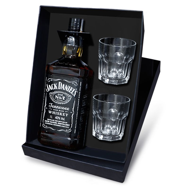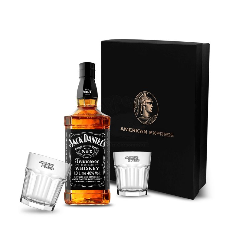 Kit com whisky personalizado com 1 Whisky Jack Daniels Old nº 7 1L, 2 copos de vidro com capacidade para 320 ml cada e embalagem personalizada em papel paraná 80gr revestido de papel color plus. É o presente ideal para presentear colaboradores, fornecedores e clientes em momentos memoráveis.