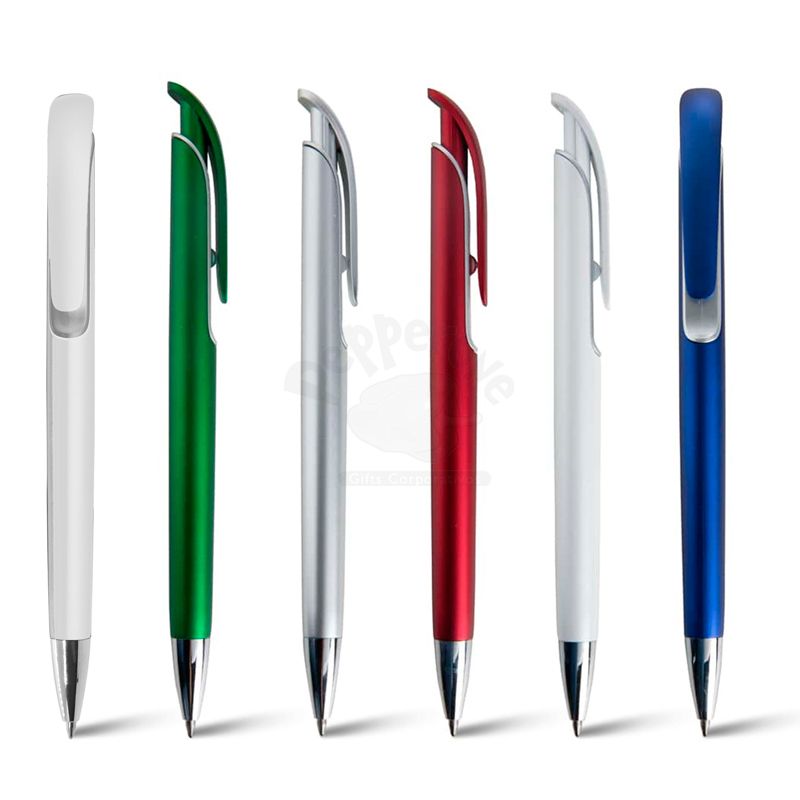 Caneta plástica personalizada com design inovador, possui detalhe colorido, clip plástico, ponteira de metal e acionamento da escrita por click. Ideal para brindes promocionais e eventos corporativos.