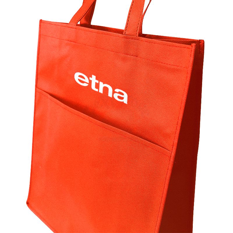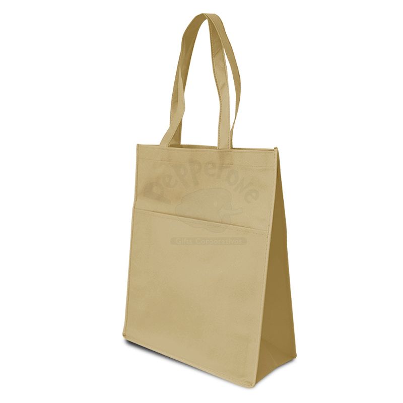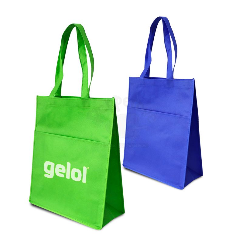 Sacola em TNT personalizada com bolso frontal externo, compartimento principal com amplo espaço interno e alças para transporte (tamanho da alça 25cm). Ideal para brindes promocionais e eventos corporativos.