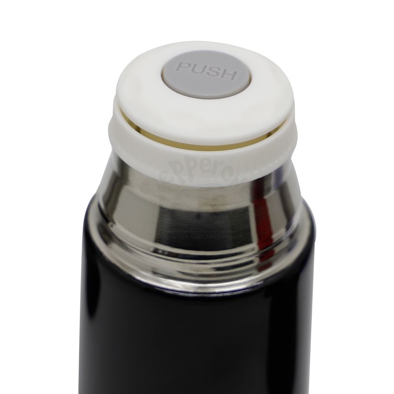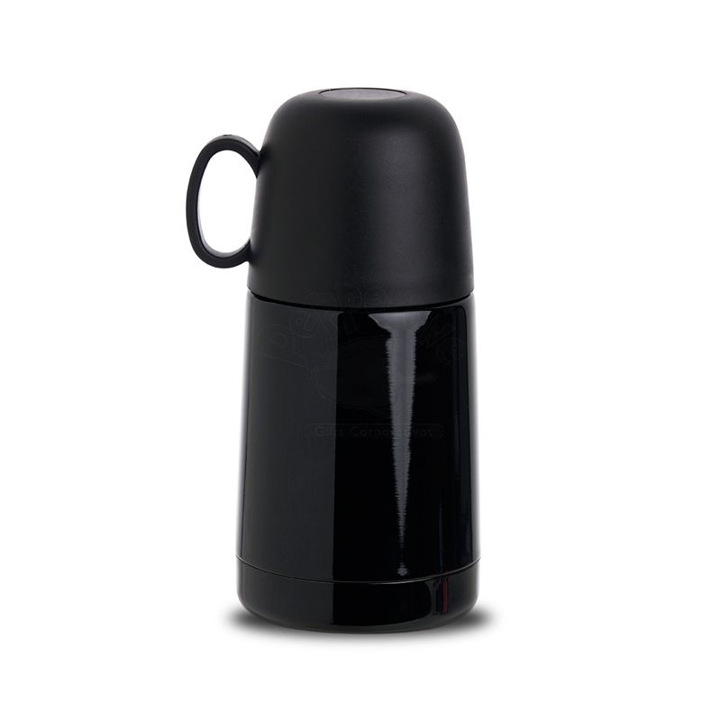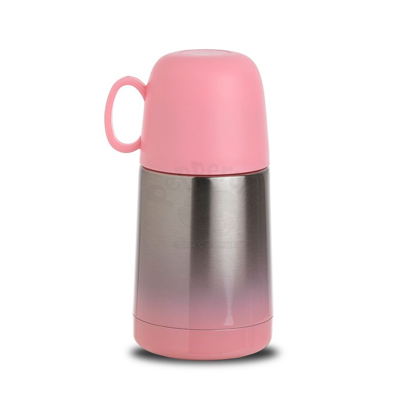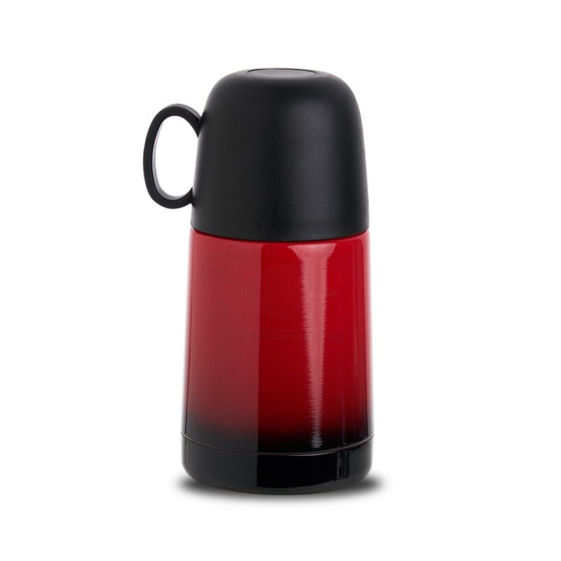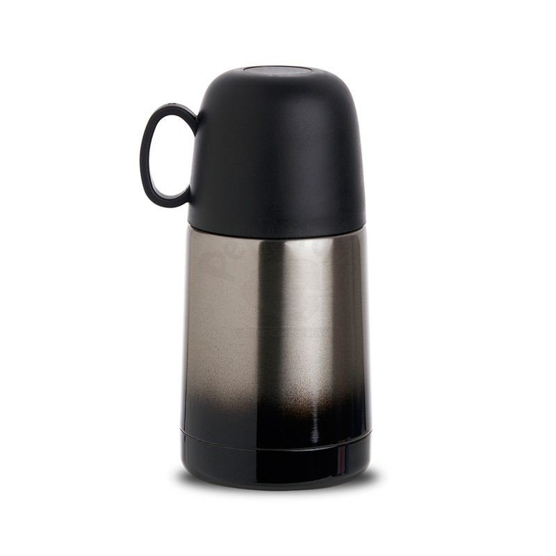 Garrafa térmica 250ml com acabamento degradê, contém tampa hermética rosqueável com botão de acionamento e tampa externa plástica com alça, podendo ser utilizada como xícara.