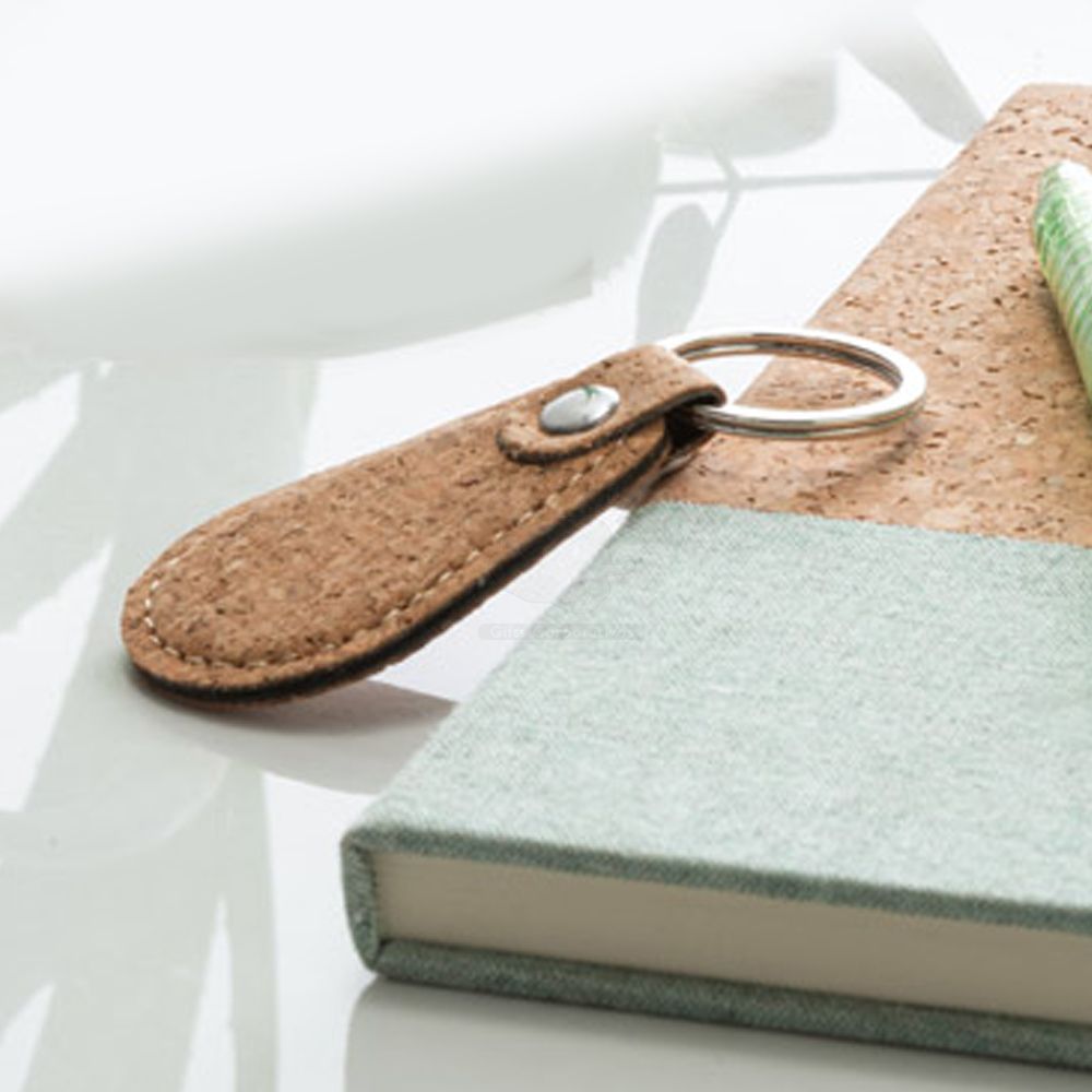 Chaveiro em cortiça personalizado com argola de metal e acabamento em costura. Ideal para brindes promocionais e eventos corporativos.
