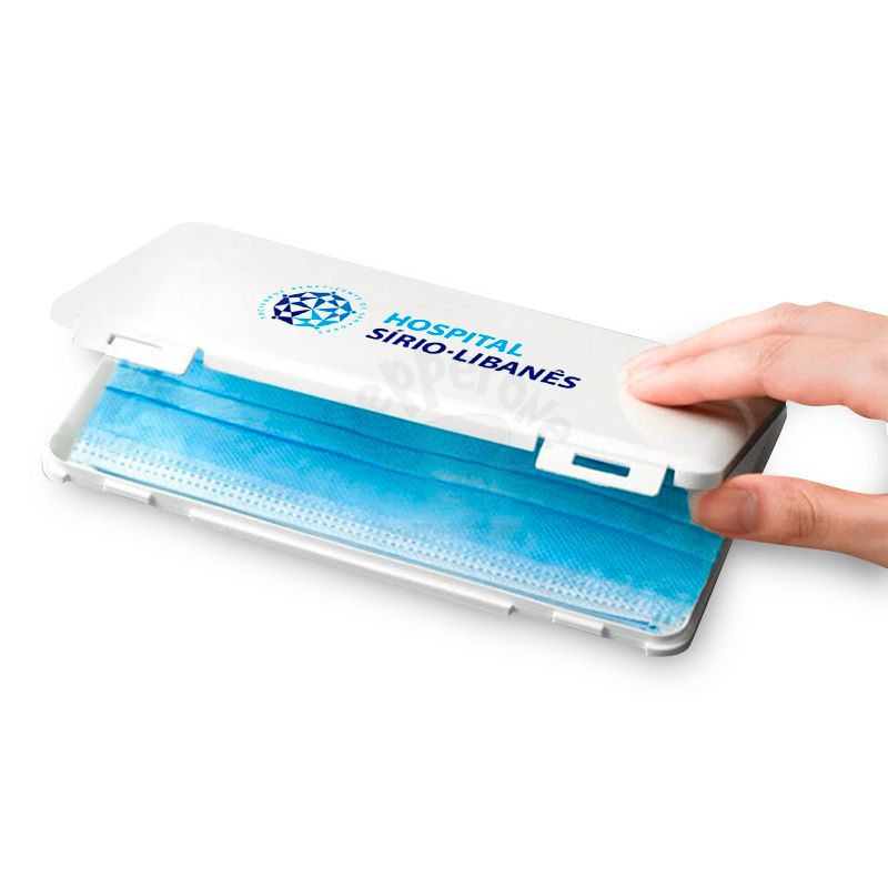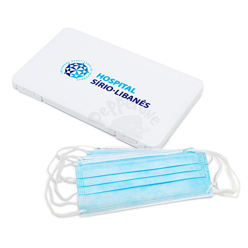 Porta máscara personalizada produzido em plástico BPA FREE com acabamento brilhante. Possui tampa protetora com trava destacáveis e compartimento para 5 máscaras inclusas confeccionada em non-woven / melt-blown non-woven com três camadas que assegurada proteção do meio envolvente das partículas emitidas pelo usuário da máscara através de capacidade de filtragem PFE 90% (recomendação EU: PFE 70%). Respirabilidade > 8l/min e diferencial de pressão < 40 Pa/cm2. Ideal para brindes promocionais e ventos corporativos. Imagem ilustrativa.