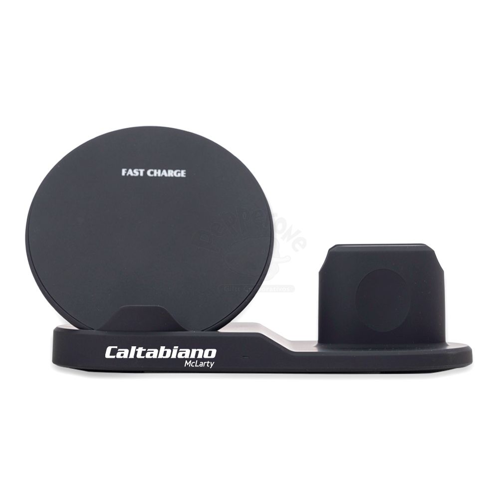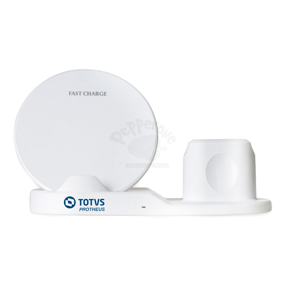 Carregador wireless personalizado 3 em 1 para celular, smartwatch e fones tipo airpods. Com sistema de carga por indução rápida, a estação permite o carregamento sem fio de celulares e smartwatchs habilitados com estas tecnologias, além destes suportes, a estação conta ainda com um carregador para fones estilo airpods através do conector Lightning. Entradas: 5V-2A / 9V-2A, Saída smartphone: 5W-7.5W-10W, Saída smartwatch: 2w, Saída fone: 3W Distância de recepção: 2-10mm, Conversão: Frequência: 100-205KHz. Sua base contém tapetes de silicone antiderrapantes e frestas inferiores para auxiliar na dissipação de calor durante o carregamento. Acompanha cabo USB. Compatível com Iphone Xs/MAX/XR/X/8/8Plus/s8/S8Plus/11Pro/11ProMAX/12, Galaxy note 9/8/7/5/S9/S9 Plus/S8/S8 Plus/S7/S7 edge/s6 edge Plus. Obs: Versões Plus acima de 6.1 Polegadas não são compatíveis com o carregamento wireless.<\strong> Imagens Ilustrativas.