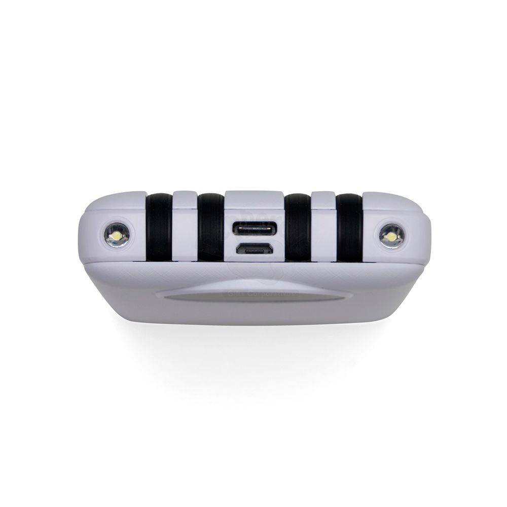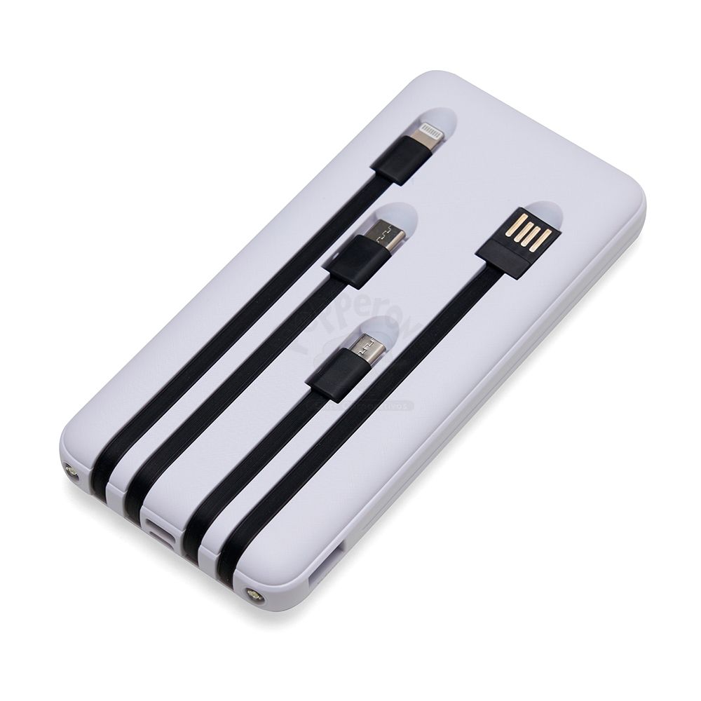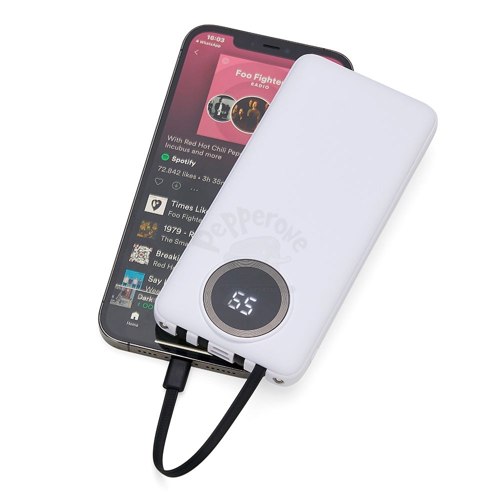 Carregador portátil personalizado com capacidade de carga de 10.000mAh com display digital indicador de bateria, contém duas lanternas de led e quatro cabos de saída acoplados, sendo: saída Lightning, saída Tipo-C, saída V8 e saída USB. O carregador possui uma porta USB dupla (entrada e saída) com carga rápida e outras duas portas de entrada: V8 e Tipo-C. Acompanha cabo USB.