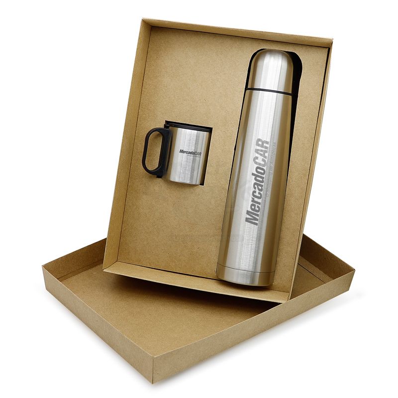 Kit personalizado com garrafa térmica e caneca em metal Inox com acabamento aço escovado. Acompanha 1 garrafa térmica 1L e 1 canecas com capacidade para 180ML acondicionados em uma embalagem de papel kraft 400gr. Ideal para brindes promocionais e eventos corporativos.
