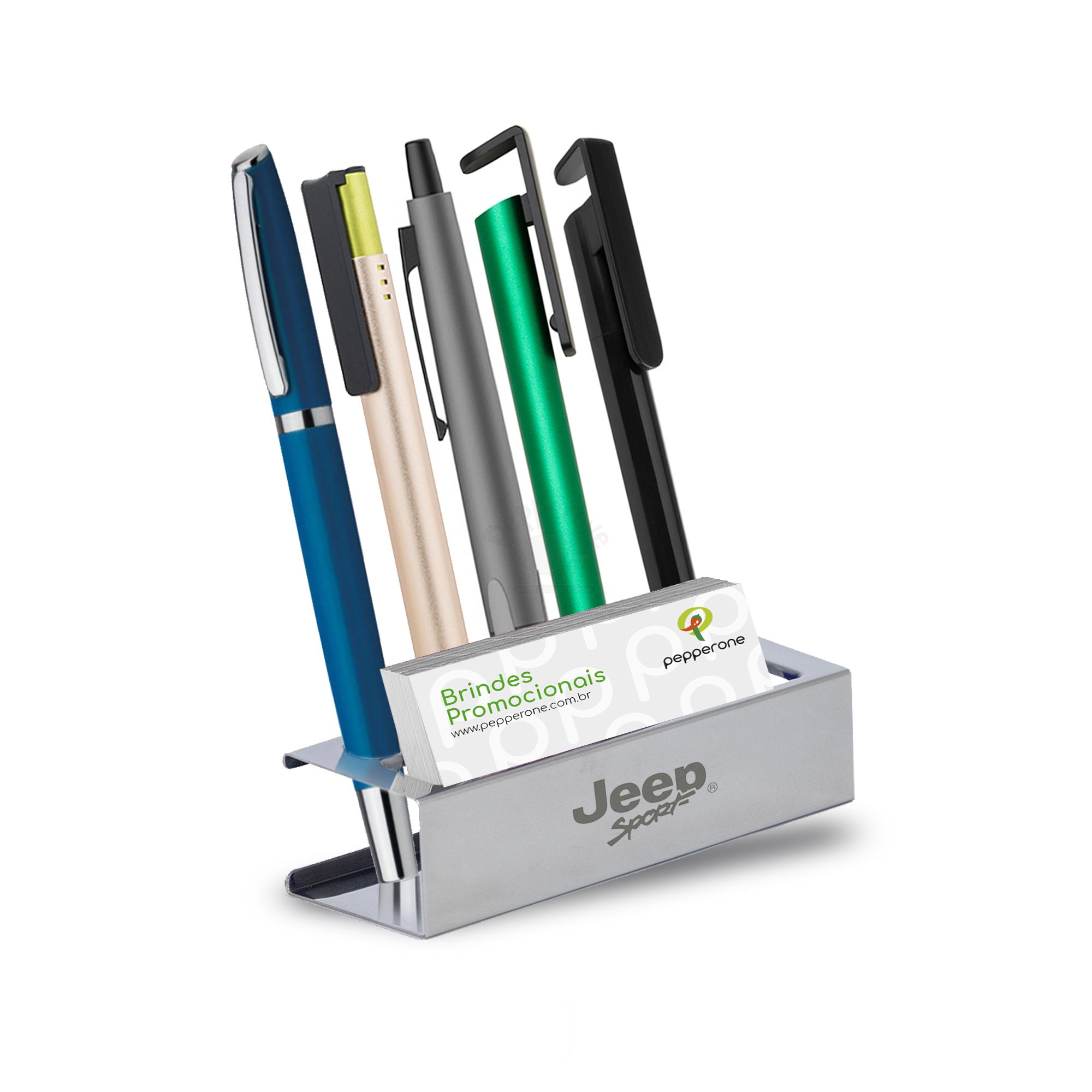 Porta caneta de metal personalizado produzido em metal com chapa de metal 0,64mm. Possui compartimento para 5 canetas e um porta cartões com capacidade para 50 cartões aproximadamente. Ideal para brindes promocionais e eventos corporativos. Imagem ilustrativa.