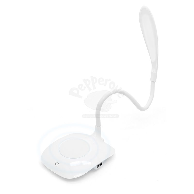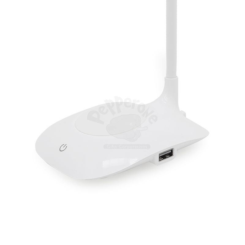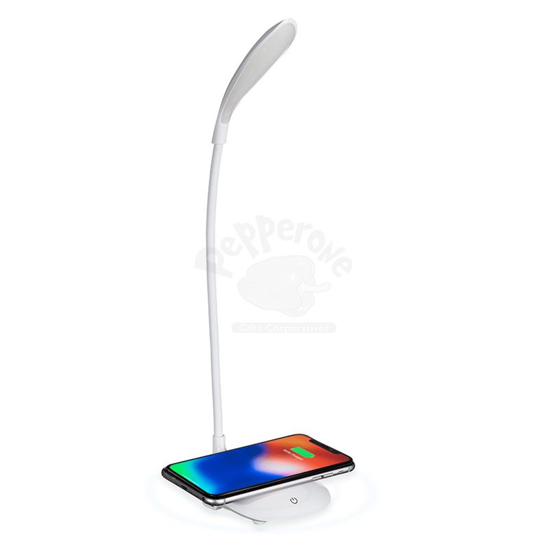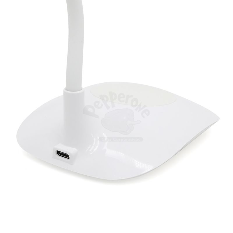 Luminária LED de mesa com haste articulável e superfície para carregar dispositivos por indução (wireless) de 5W. Produzida em ABS e PC possui entrada de corrente: DC 5V/3ª, 28 LEDs branca / amarelo, LED com 3 posições de ajuste de brilho e potência do carregador “Wireless”: 5W. Obs: Acompanha cabo USB-C. Imagem ilustrativa.