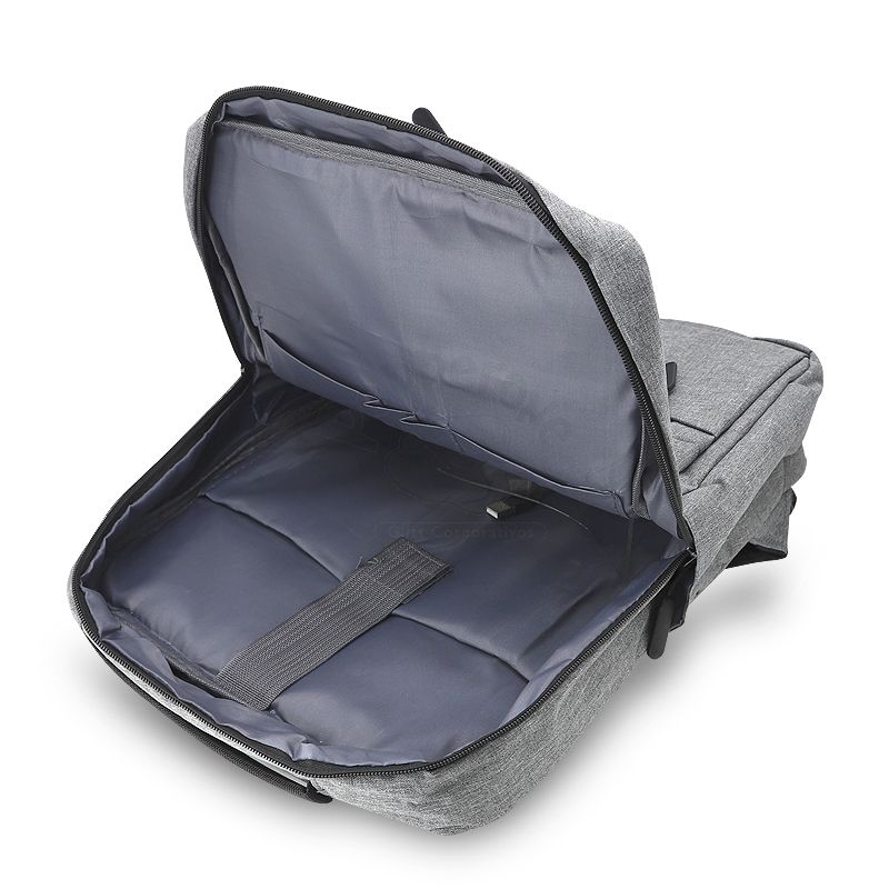 Mochila para notebook personalizada produzida em nylon com compartimento para notebook até 15,6 polegadas. Contém compartimento grande 18L, com divisórias para documentos, eletrônicos e caneta, dois compartimentos frontais com abertura horizontal, bolso lateral e adaptador USB externo com cabo acoplado, permitindo a conexão de um carregador portátil de dentro da mochila e transferência da carga para o lado externo, ocultando o carregador e viabilizando a utilização do celular durante o processo. Contém zíperes com pegadores plásticos, alça de mão em nylon e alças para as costas ajustáveis com revestimento espumado antitranspirante. Ideal para brindes promocionais e eventos corporativos. Power Bank não acompanha o produto. Obs: Para a entrada lateral USB funcionar como carregador, é necessário a aquisição de um de nossos Power Banks. * Imagem ilustrativa.