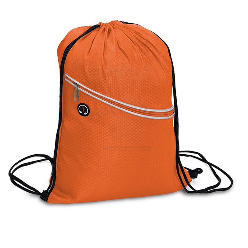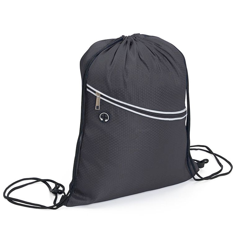 Mochila saco personalizada produzida em fibra de poliéster resistente à água. Contém bolso diagonal na parte frontal com entrada para fones de ouvido e alças de nylon. Ideal para brindes promocionais e eventos corporativos. Obs: Fone de ouvido não acompanha o produto.