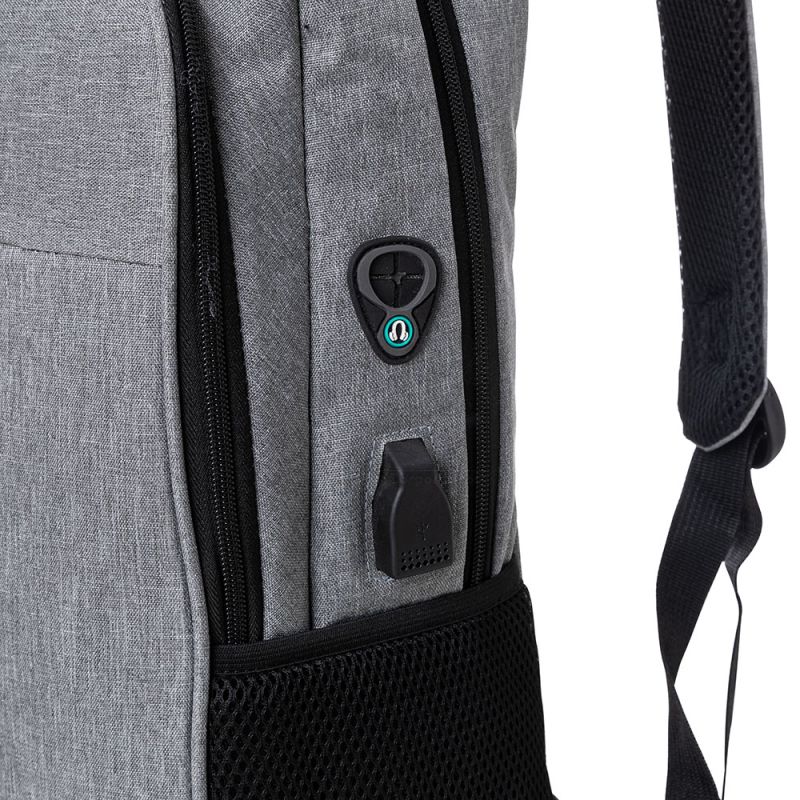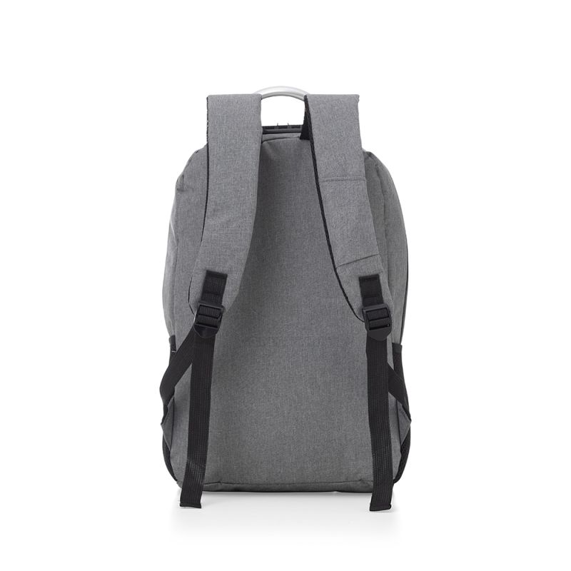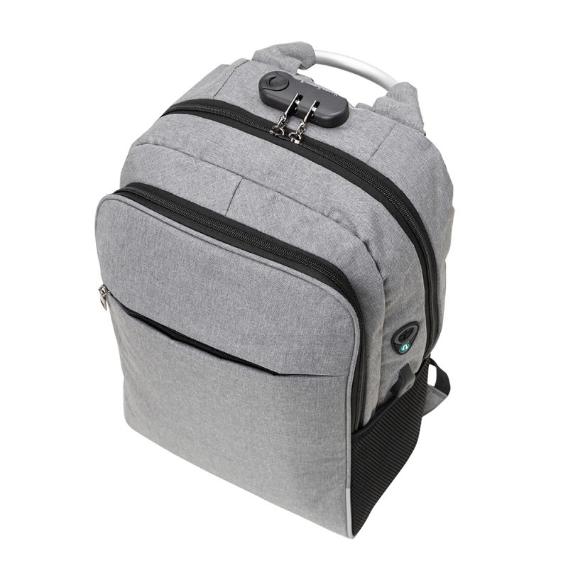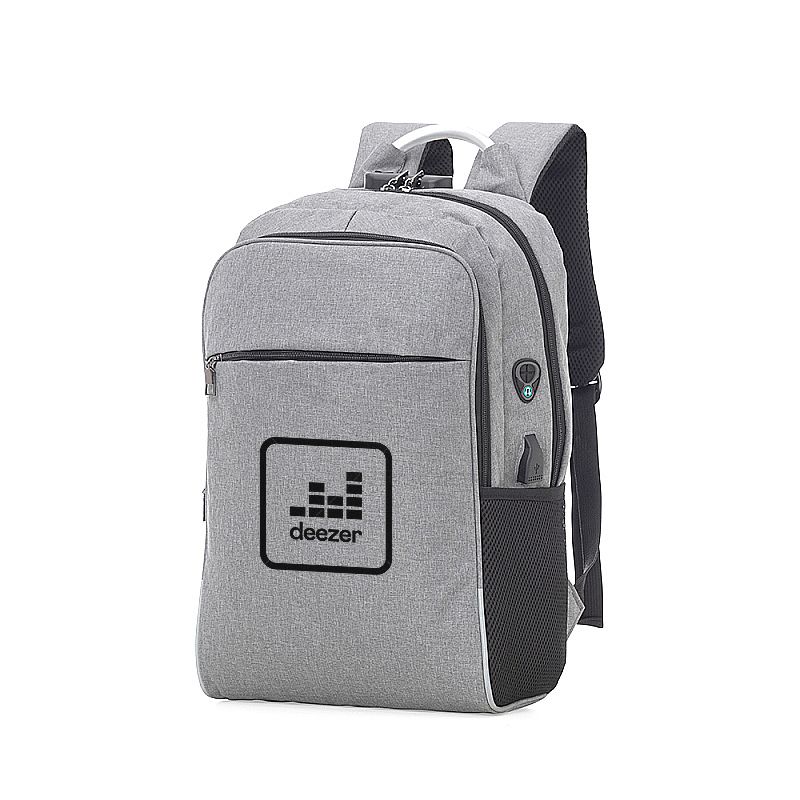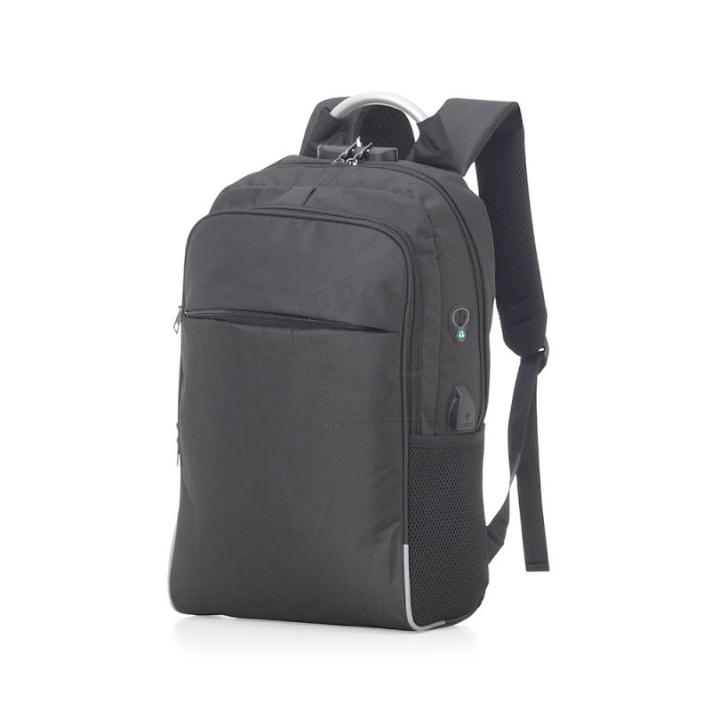 Mochila para notebook personalizada produzida em poliéster. Possui compartimento interno para notebook de 14.5 Polegadas, cursores de metal, fechamento por cadeado com senha, alça de mão em metal, alça de ombro acolchoada, 2 bolsos frontais, 2 bolsos laterais, mini bolso na alça de ombro, conector USB na lateral e saída para fones de ouvido na lateral. Ideal para brindes promocionais e eventos corporativos.