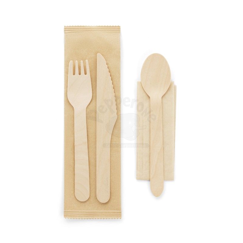 Conjunto de talheres descartáveis em madeira personalizado. Possui embalagem e guardanapos com folhas duplas em papel kraft , 1 garfo, 1 faca e 1 colher. Ideal para refeições em geral. Obs: Não será possível fazer a personalização nos talheres e guardanapo devido a embalagem ser lacrada. A personalização será somente na parte externa (Embalagem). * Imagem ilustrativa.