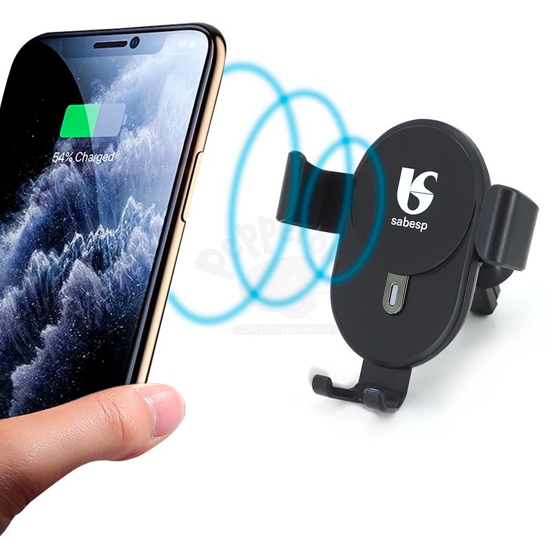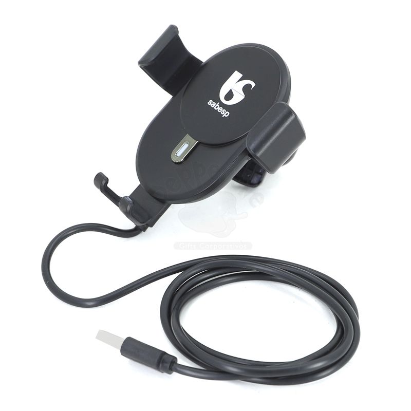 Suporte veicular wireless para carregamento por indução personalizado. Possui abertura ajustável das hastes laterais proporcionando um melhor ajuste ao smahrtphone, entrada inferior Micro USB, Led frontal com indicador, base e hastes com acabamento emborrachado antideslizante, suporte traseiro com fixador regulável em rotação 360º, cabo USB para carregamento / micro USB, entrada: DC5V- DC9V-2A, saída: D10W - 7.5W - 5W - 20W - 15W, hastes com travas automáticas quando ajustadas no smartphone, distância do carregamento sem fio: 0,5 à 8mm. Compatível somente com aparelhos que possuam o modo ''Qi'' de carregamento por indução. Ideal para divulgar sua empresa em eventos corporativos, brindes personalizados e campanhas promocionais. *Imagem ilustrativa