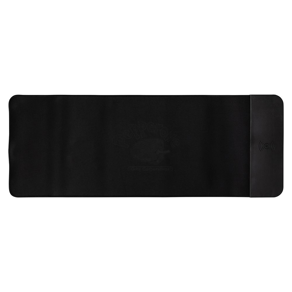 Desk Pad carregador por indução, Mouse pad com espaço suficiente para seu mouse e teclado, ainda oferecendo uma estação de carregamento wireless em sua parte lateral. Imagem ilustrativa, o produto acompanha apenas cabo USB e manual de instruções.
