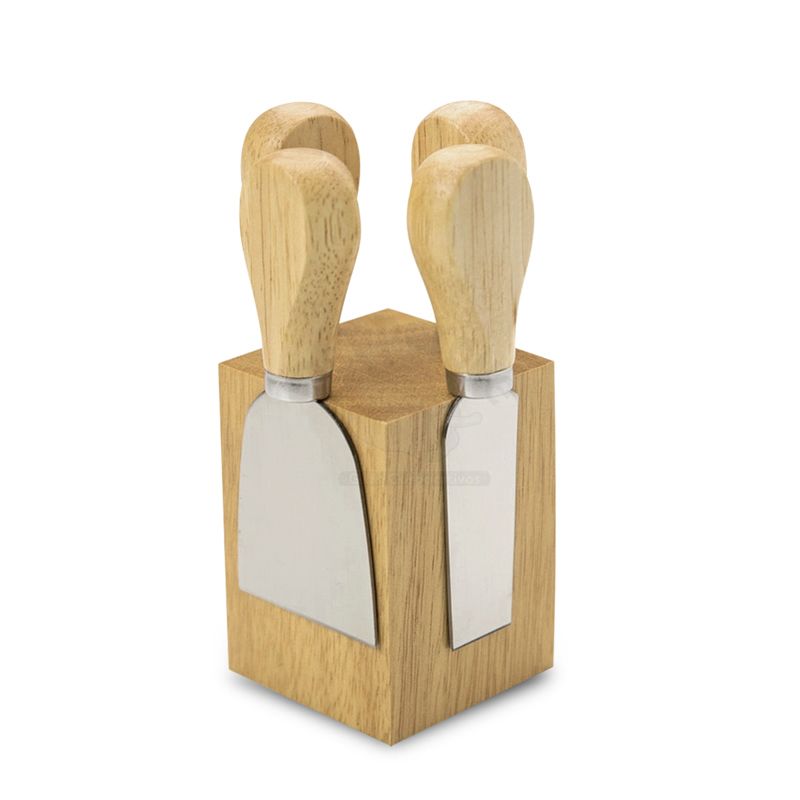 Kit queijo 4 peças personalizado possui suporte de madeira central para fixar as peças após o uso,1 Espátula, 1 faca de ponta reta, 1 faca de ponta, 1 garfo. Lâminas para cortes preciso de alta durabilidade. Ideal para brindes promocionais e eventos corporativos. Obs: Tamanho montado: 145 x 73 x 72 mm