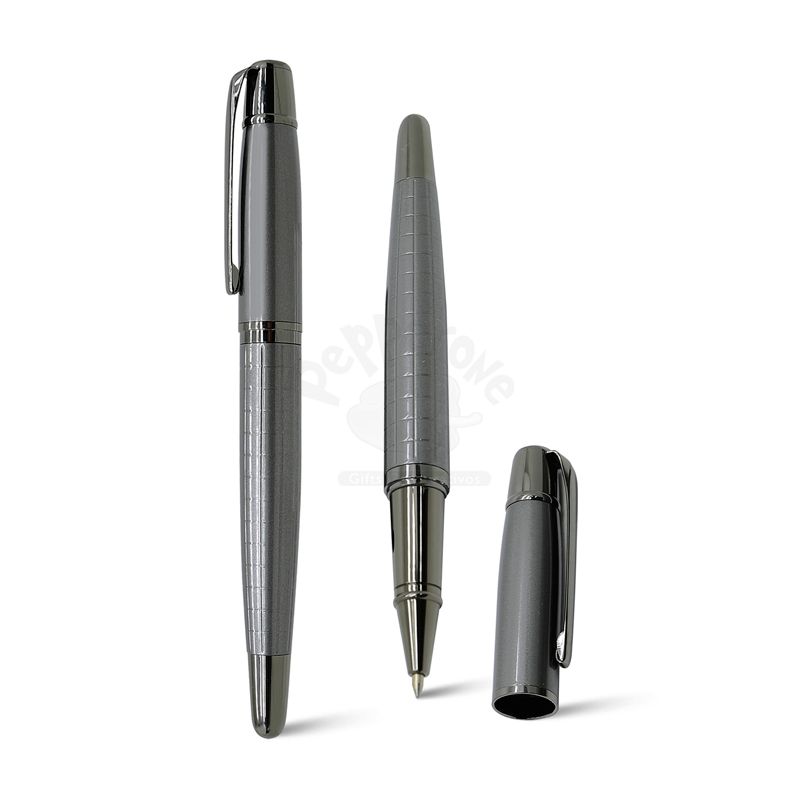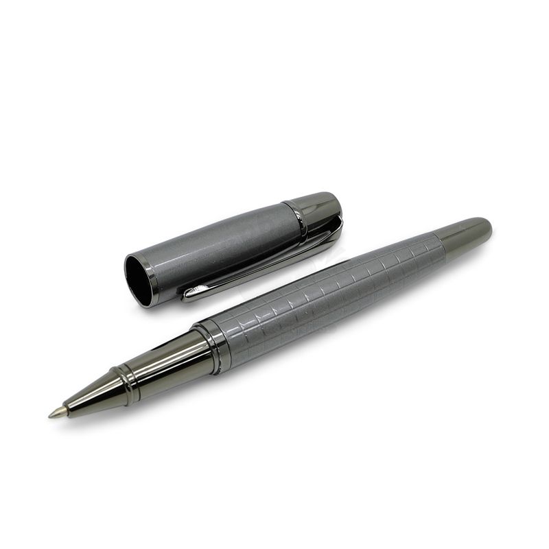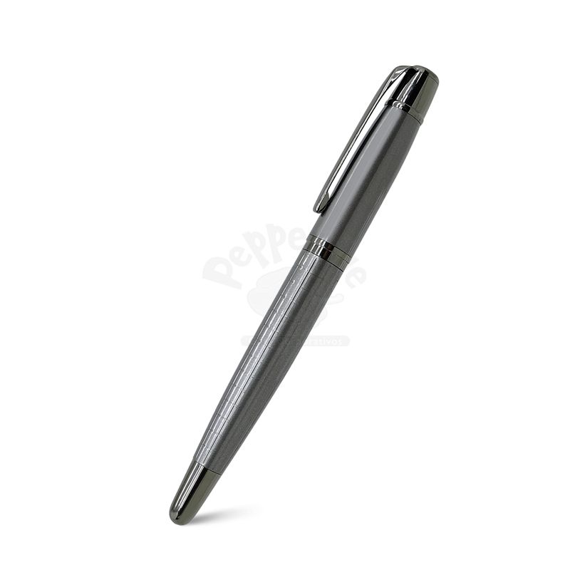 Caneta roller de metal personalizada com escrita azul, macia e confortável. Possui clip de metal e detalhe diferenciado com toque elegante e luxuoso no corpo da caneta. Ideal para brindes promocionais e eventos corporativos