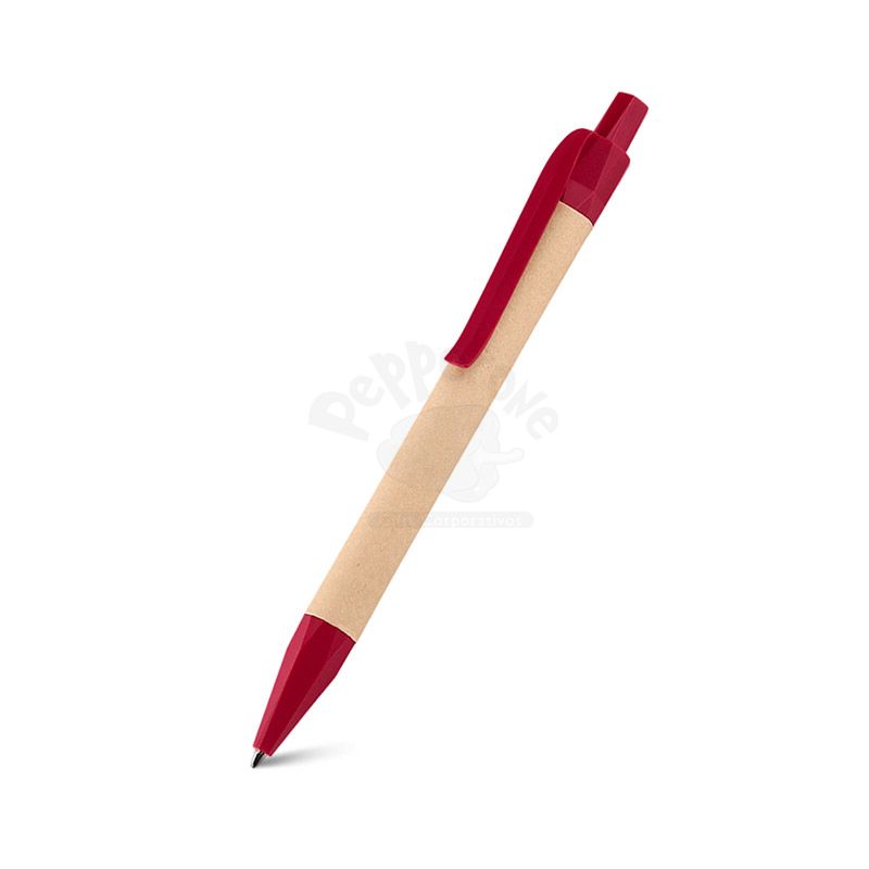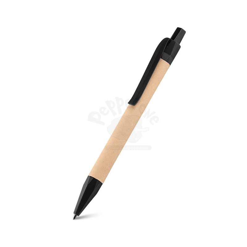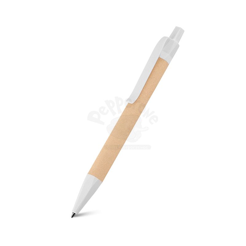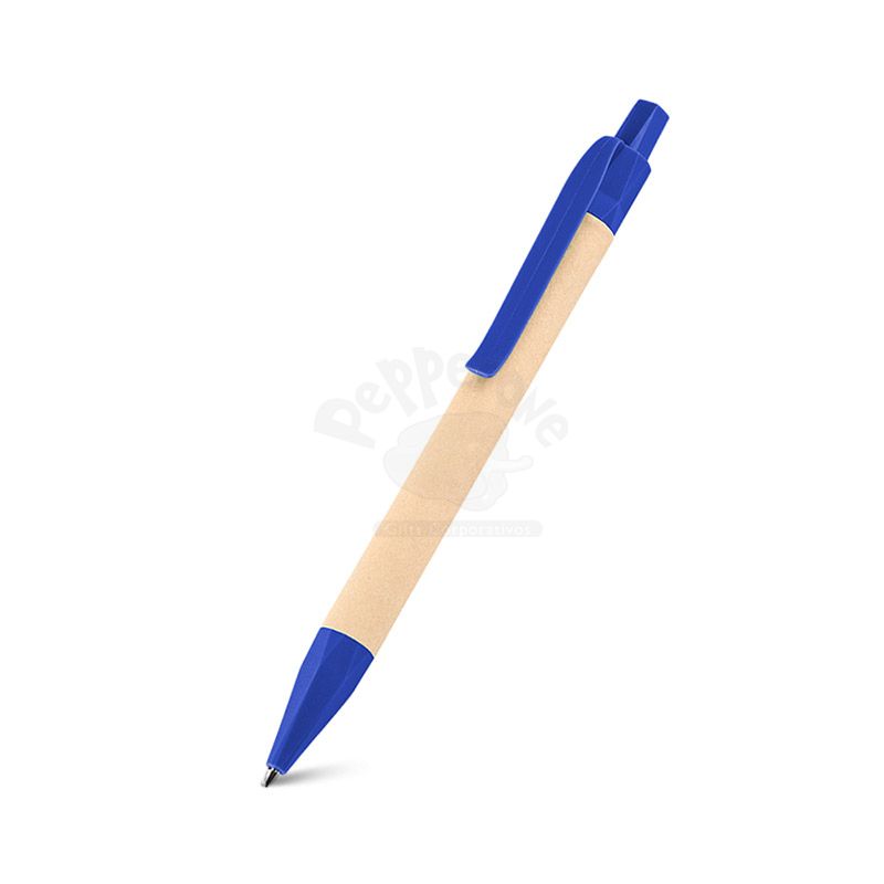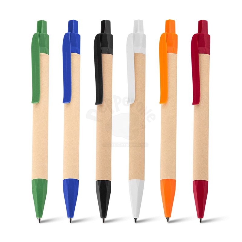 Caneta ecológica personalizada produzida em papel reciclado, possui clip e ponteira em PLA biodegradável, acabamento geométrico no clip e na ponteira, esferográfica na cor azul, e acionamento da escrita por click. Ideal para brindes promocionais e eventos corporativos.