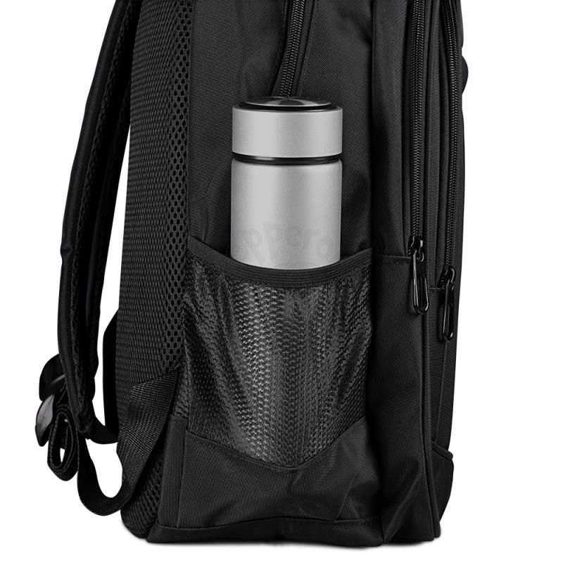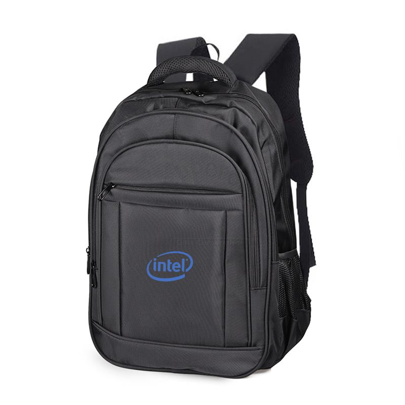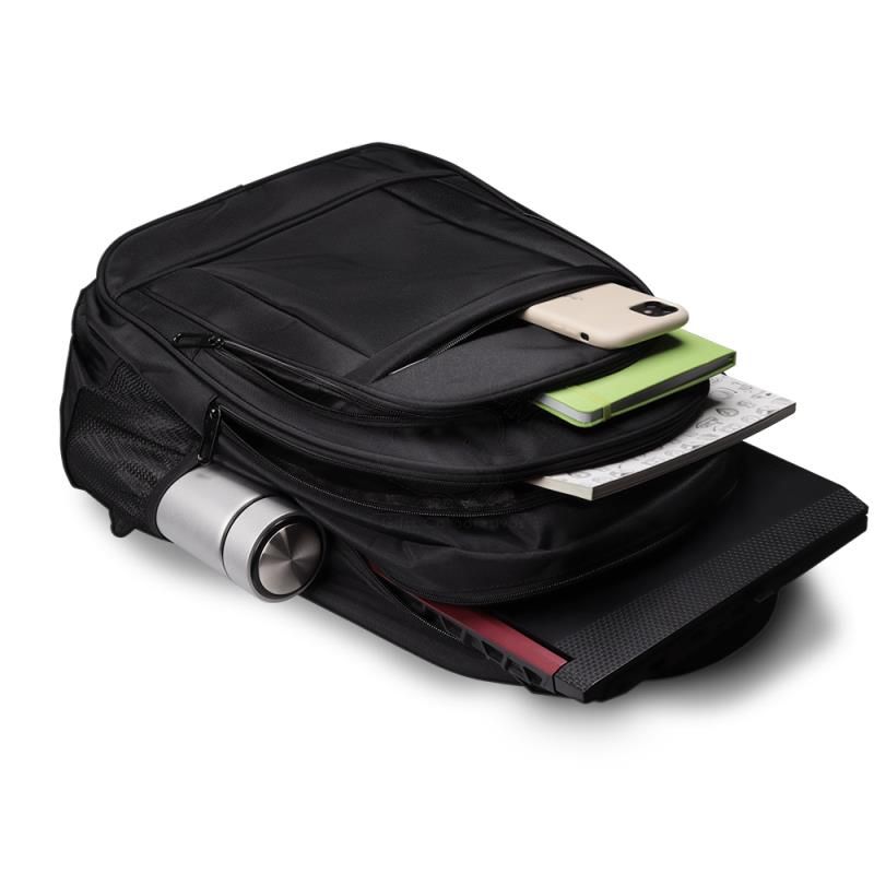 Mochila para notebook personalizada produzida em tecido poliéster. Possui, parte externa: 3 Bolsos frontais com zíper; 2 Bolsos laterais; Alça de mão e ombro acolchoadas. Parte interna: Compartimento para notebook de até 17 polegadas. Ideal para brindes promocionais e eventos corporativos. Imagem ilustrativa. Obs: Compatível com tamanho de notebook máximo de 40 x 28 Cm.