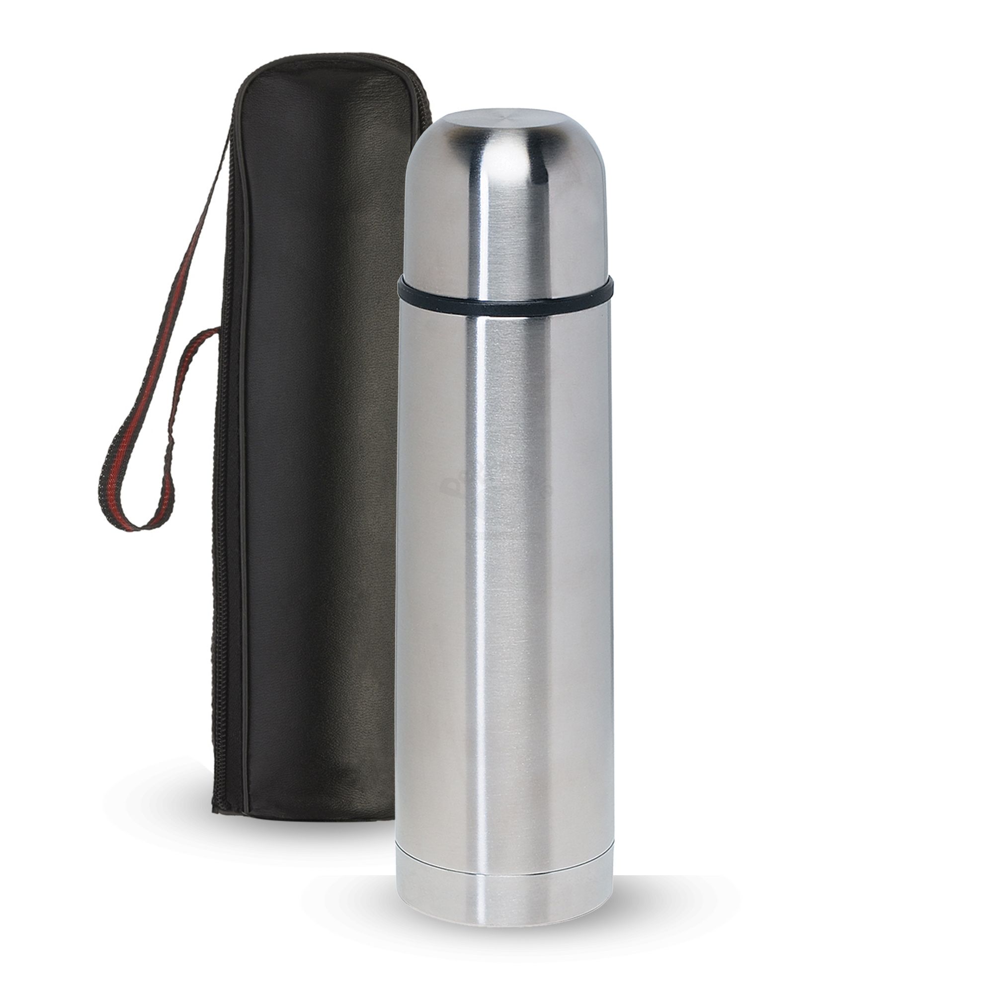 Garrafa 500ml em inox com tampa rosqueável, tampa interna em plástico resistente(basta um clique para abrir ou fechar). Acompanha capa protetora de couro sintético com alça de nylon.
