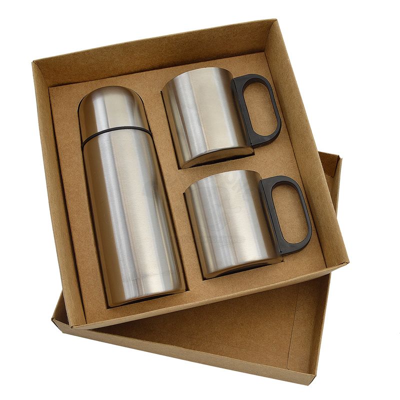 Conjunto de Garrafa e Caneca em Inox com acabamento aço escovado. Acompanha 1 Garrafa térmica 350ML e 2 Canecas térmicas com capacidade para 180ML acondicionados em uma embalagem de papel kraft 400gr.