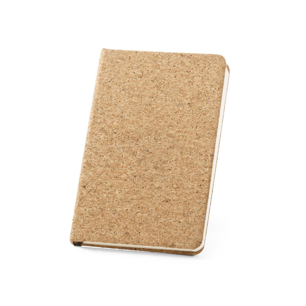 Bloco de anotações personalizado produzido em cortiça formato A5 com 80 folhas não pautadas na cor marfim e marcador de páginas. Ideal para brindes promocionais e eventos corporativos.