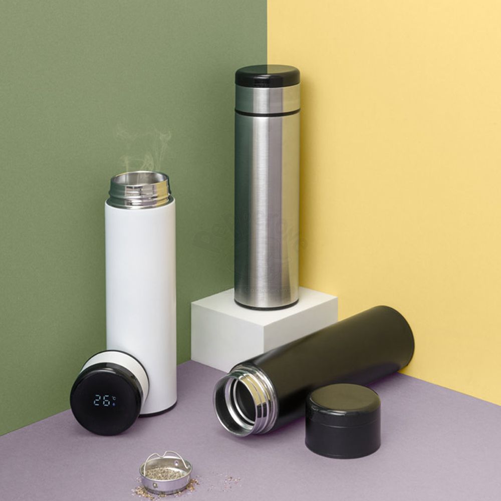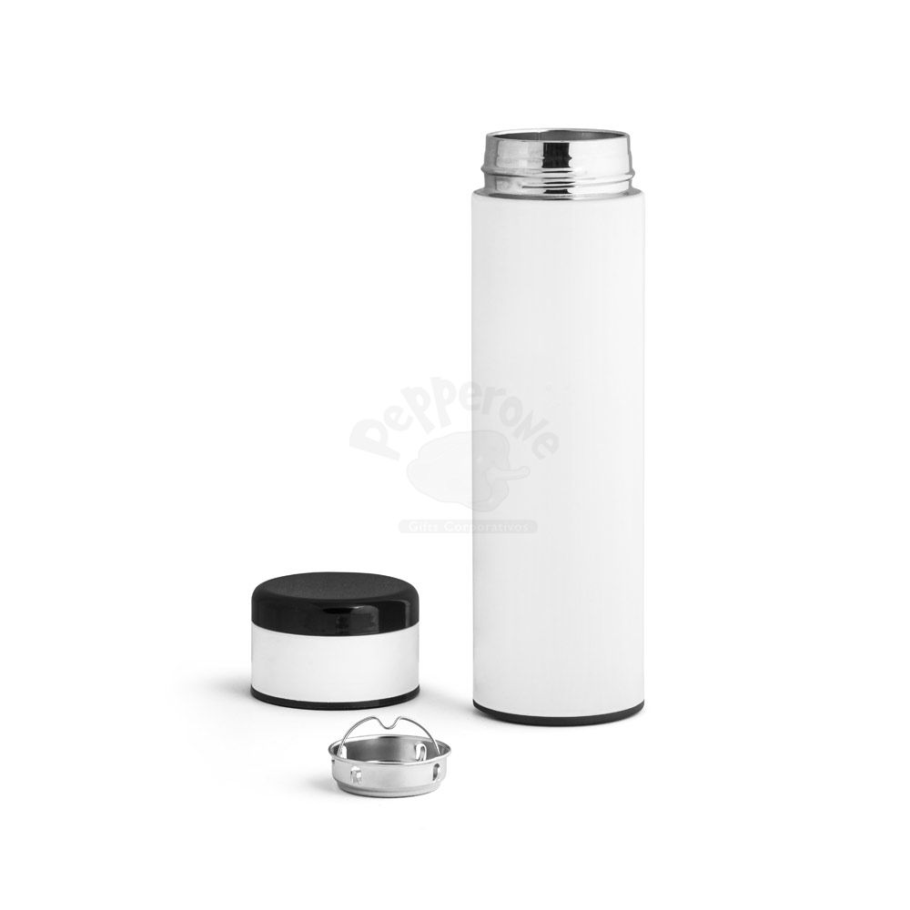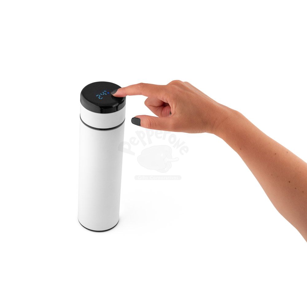 Garrafa térmica personalizada com capacidade para 450ml. Possui parede dupla em aço inox, tampa com visor em LED e termômetro digital que permite com um simples toque saber a temperatura do líquido no interior do garrafa. Incluso na tampa um sistema de fácil acesso à bateria para substituir quando necessário. Ideal para brindes promocionais e eventos corporativos. Imagem ilustrativa.