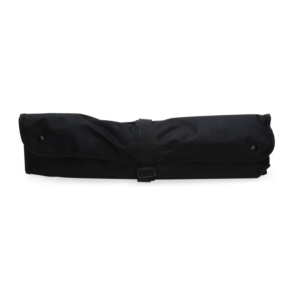 Kit churrasco 8 peças em estojo de nylon. Contém espátula, garfo, faca, pegador, dois saleiros, luva e avental (também utilizado como estojo). Talheres de inox com acabamento de madeira e avental de nylon com alça ajustável – possui botão e alça com fivela para lacre.