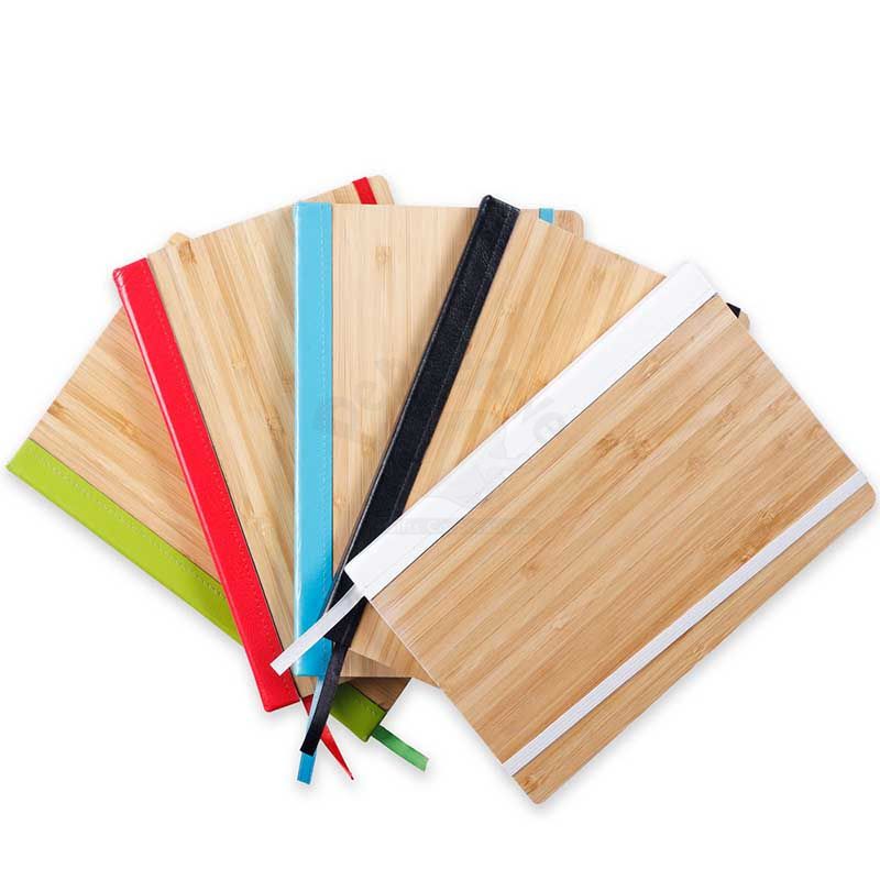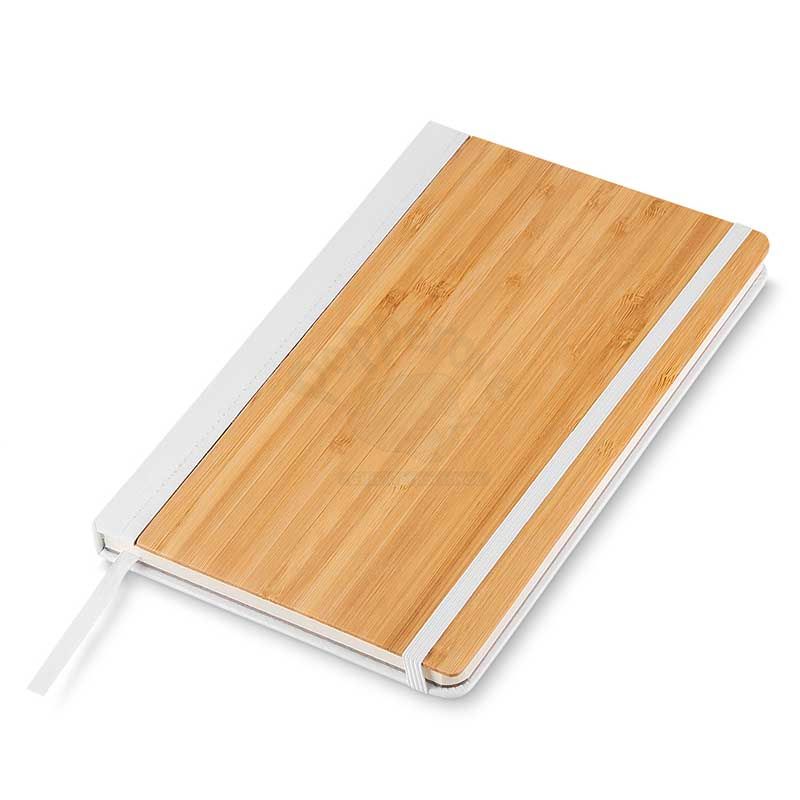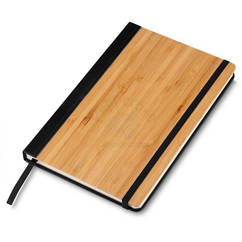 Bloco de anotações personalizado formato A5, produzido em bambu com capa dura. Possui elástico para fechamento que acompanha a cor predominante no produto, 70 folhas pautadas e marcador de páginas em cetim também na cor. Ideal para divulgar sua empresa em eventos corporativos.