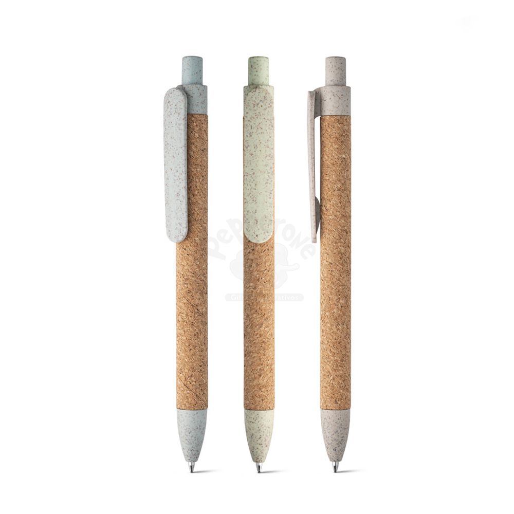 Esferográfica em cortiça com clipe e elementos coloridos em fibra de trigo e PP.