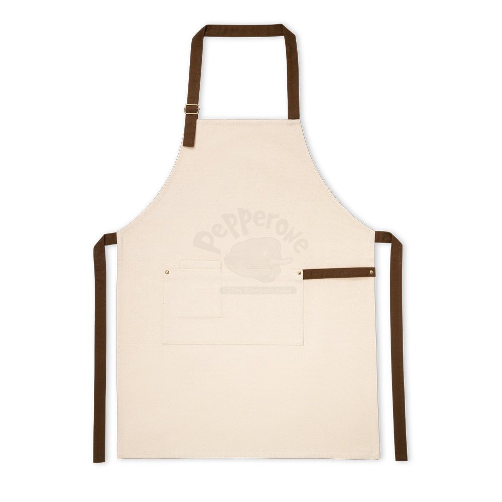 Avental em 100% algodão com detalhes em metal. Com 3 bolsos multifuncionais e uma tira lateral Tira do pescoço facilmente ajustável.