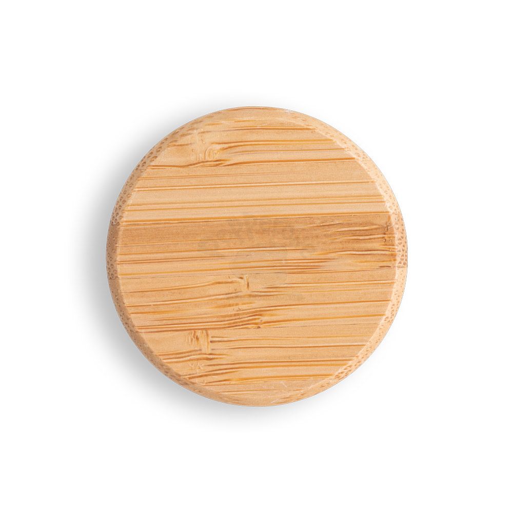 Squeeze de alumínio com acabamento mate e tampa em bambu. Capacidade até 550 ml.