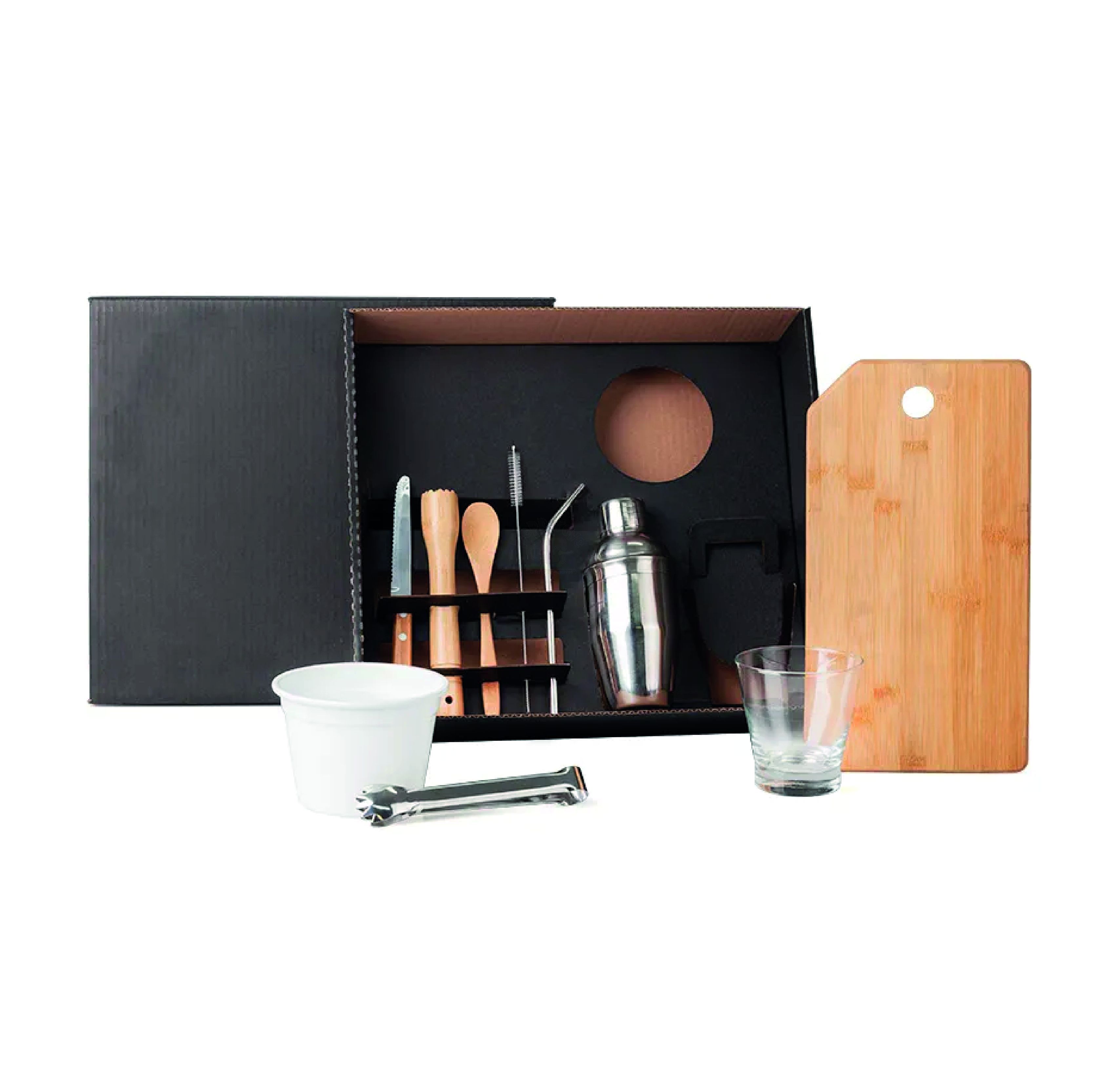 Kit para Caipirinha 10 peças. Conta com uma tábua em 1 furo, colher de 18cm e socador em Bambu, faca 4" em Bambu/Inox; coqueteleira, canudo, escova para canudo e pegador para gelo em Aço Inox, copo em Vidro e balde para gelo 750 ml em alumínio branco.