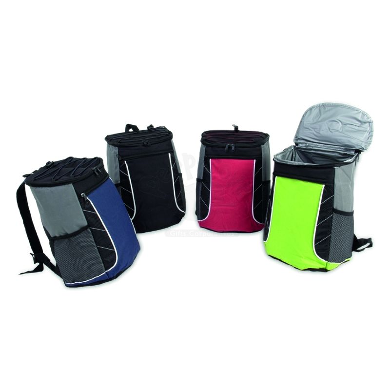 Bolsa térmica personalizada de poliéster. Possui dois compartimentos e capacidade de 18 litros. A bolsa possui revestimento térmico em PEVA atóxico, bolsos laterais telados, alça de mão e alça para as costas com revestimento espumado.