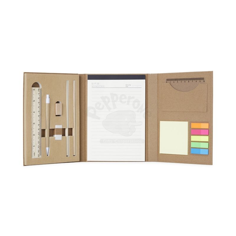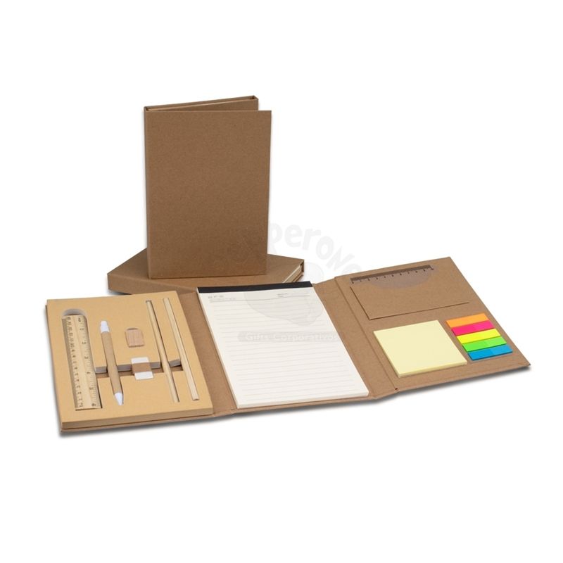 Kit ecológico para anotações, com capa kraft. Contém bloco pautado com aproximadamente 40 folhas marfim, bloco autoadesivo com aproximadamente 25 folhas amarelas, conjunto de 5 marcadores plásticos autoadesivos com aproximadamente 25 folhas, régua plástica 10 cm, régua de madeira 15 cm, borracha, apontador, dois lápis e uma caneta esferográfica azul 1.0mm com acionamento por clique.