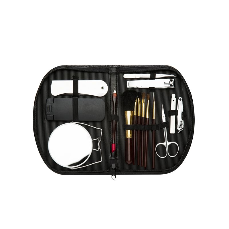 Kit manicure 15 peças em estojo de couro sintético com zíper, parte interna revestida com plástico em relevo e elástico para fixação dos itens. Possui um pente, removedor de pelos, espelho duplo, empurrador de cutícula, pinça, cortador de unha, tesoura, mini kit unha 3 em 1, cortador de cutícula e 6 pincéis: blush, sombra, esfumador, côncavo, batom e pente para sobrancelhas.
