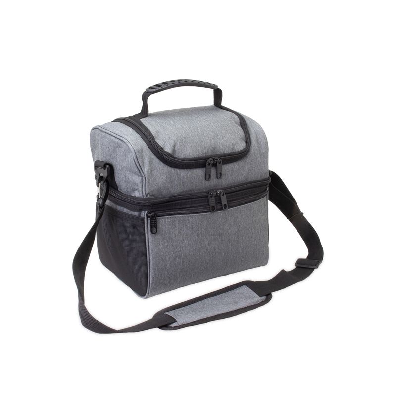 Bolsa térmica dupla de nylon com três compartimentos, capacidade de 16 litros. Contém dois compartimentos térmicos isolados, sendo o principal com costura soldada. A bolsa possui alça de mão com pegador plástico, bolsos laterais em malha e acompanha alça transversal.