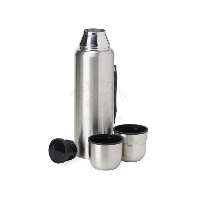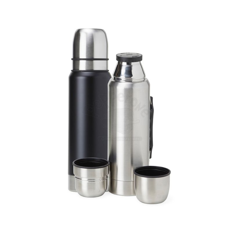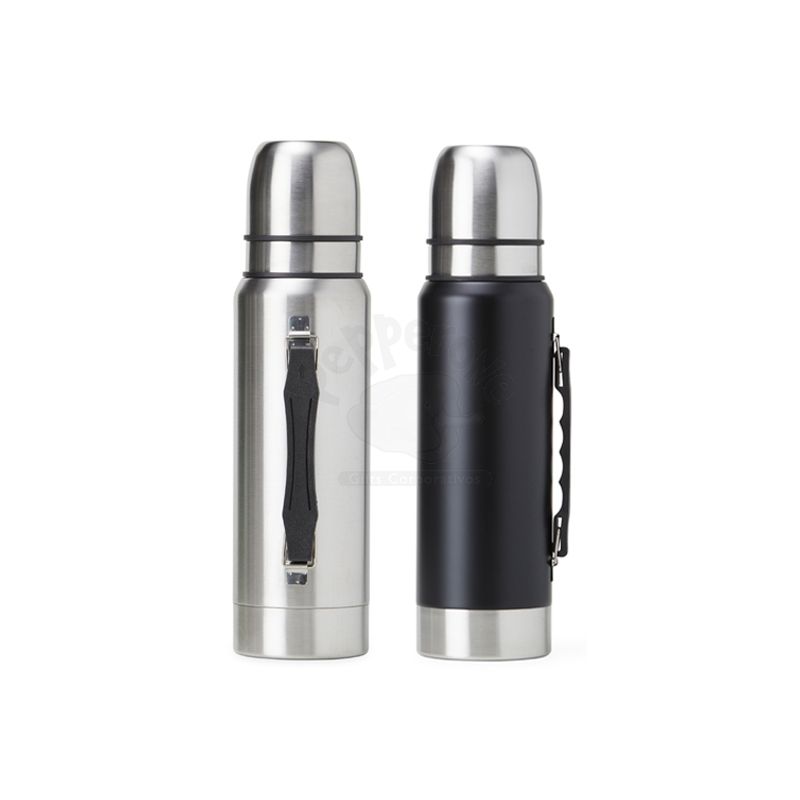 Garrafa térmica de inox com parede dupla e tampa dupla, capacidade de 1 litro. Com alça plástica para transporte, a garrafa contém duas tampas utilizáveis como copos.