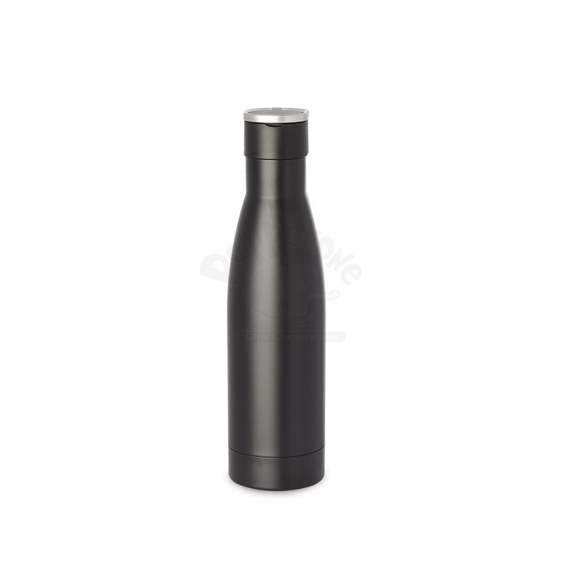 Garrafa térmica em aço inox isolada a vácuo com parede dupla, tampa de plástico com alça de transporte de aço inoxidável. Com capacidade de até 500ml.