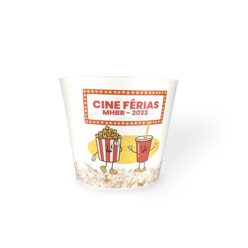 Balde de pipoca personalizado com capacidade para 2,3L, reutilizável, 100% reciclável. Decoração in mold label 360º, sem limitação de cores. Até 2 modelos, cor interna única. Ideal para brindes corporativos, eventos promocionais, cinemas e festas.