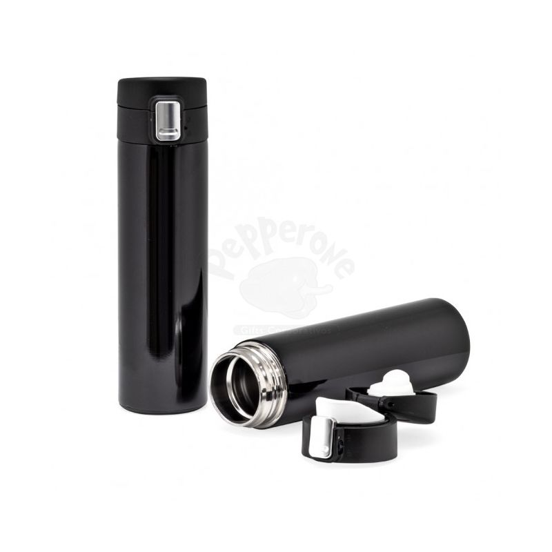 Squeeze garrafa personalizada produzido em metal inox 304, com capacidade de até 400 ml e tampa plástica atóxica rosqueável e anel de vedação em silicone para evitar vazamento, sistema de abertura automática com acionamento por botão frontal e trava de segurança para evitar que abra acidentalmente.