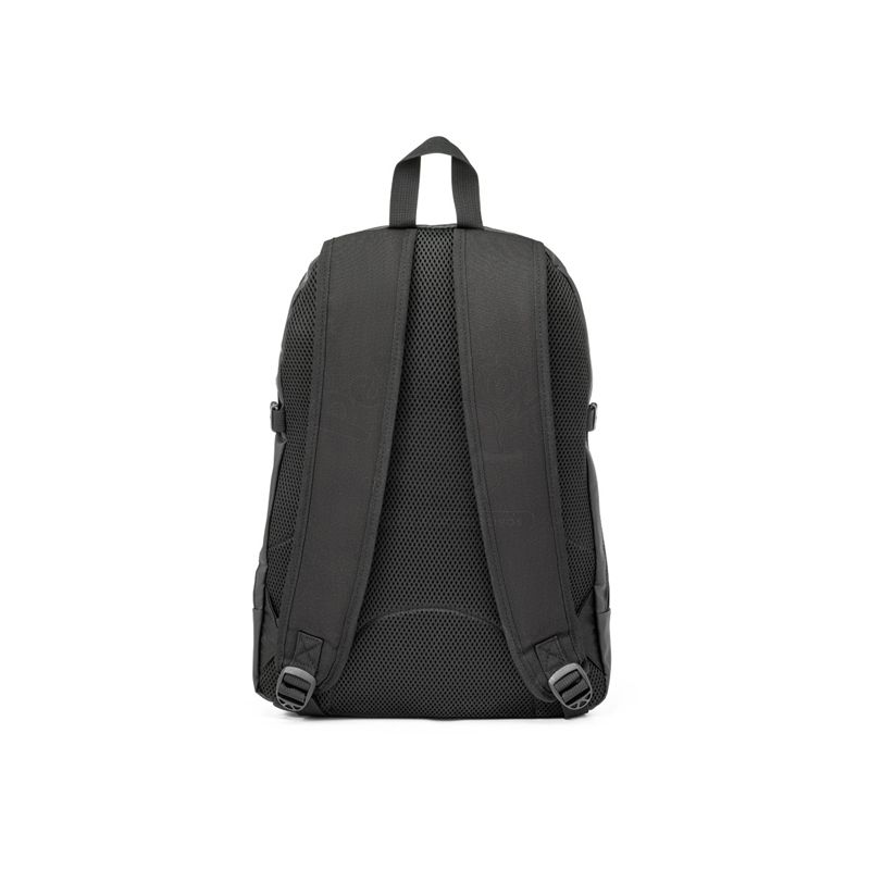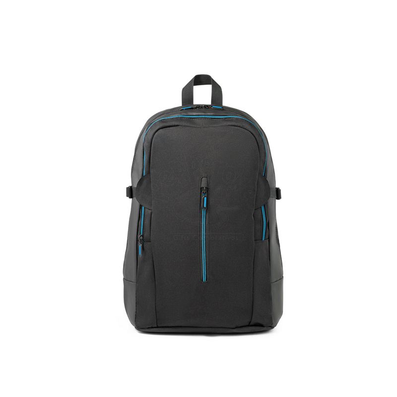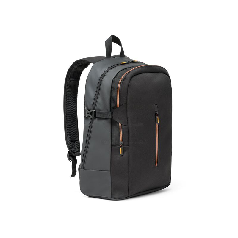 Mochila para notebook personalizada em 900D e couro sintético. Possui 2 compartimentos principais e bolso frontal. O compartimento posterior é forrado e tem divisória almofadada para notebook até 15,6" e bolso em tela, com zíper. O compartimento médio também é forrado e contém diversos bolsos interiores. A parte posterior e alças são almofadadas.
