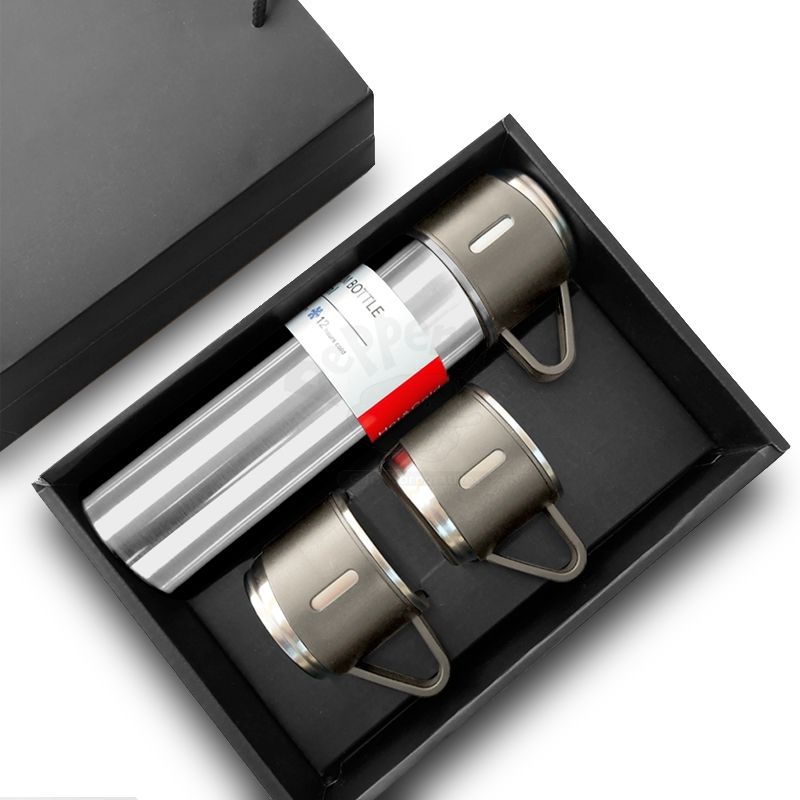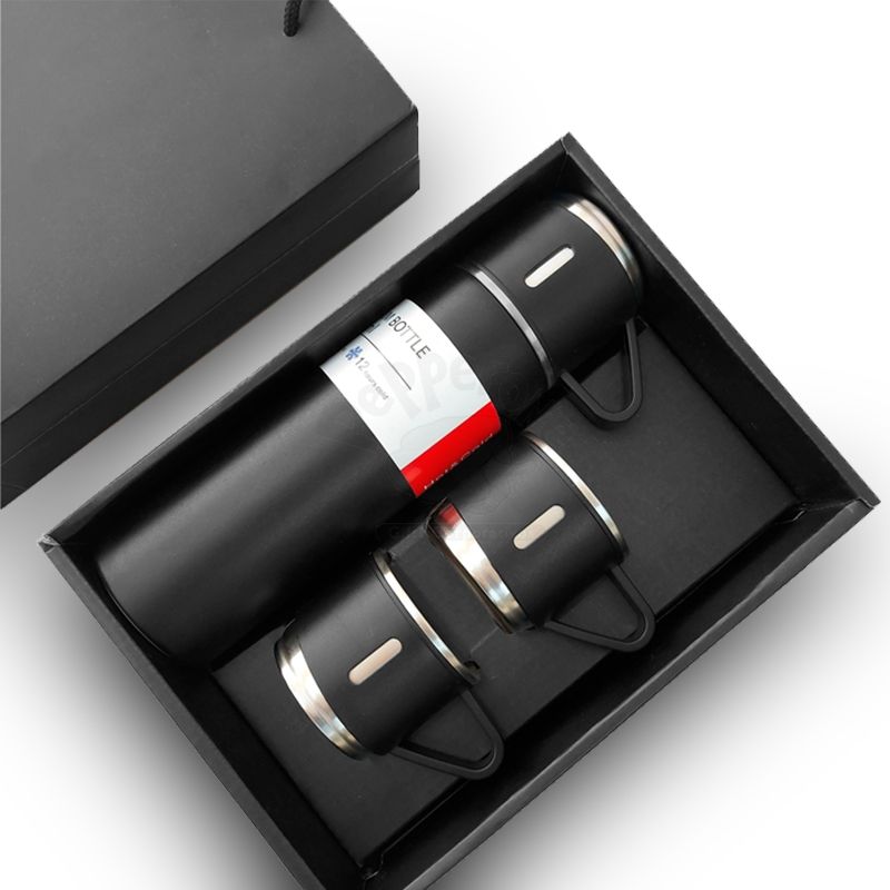 Garrafa térmica personalizada em metal com parede dupla e com pintura texturizada, tampa com clique para abertura feita em plástico com silicone e três xícaras em metal com acabamento em plástico que são rosqueáveis na garrafa. Ideal para divulgar sua empresa em eventos corporativos, brindes personalizados e campanhas promocionais.