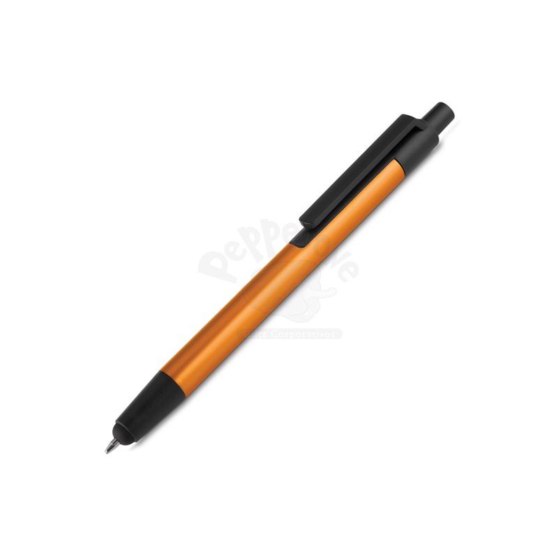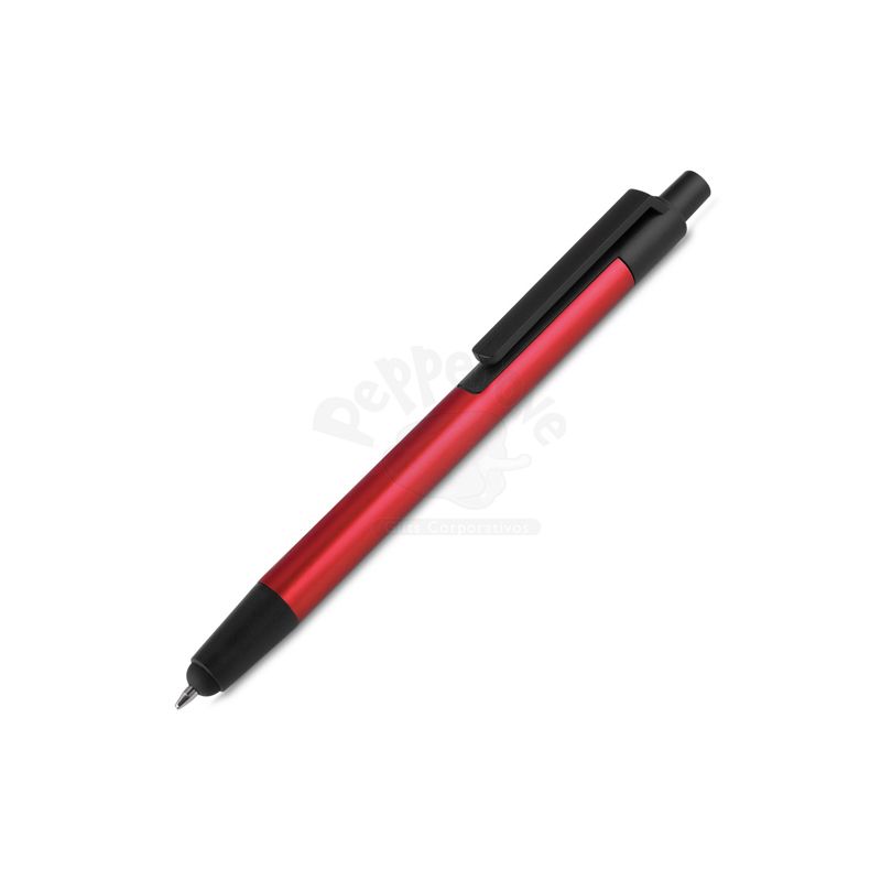 Caneta esferográfica em metal personalizada, sua escrita é azul, possui ponta touch e seu acionamento é por clique. Ideal para divulgar sua empresa em eventos corporativos, brindes personalizados e campanhas promocionais.