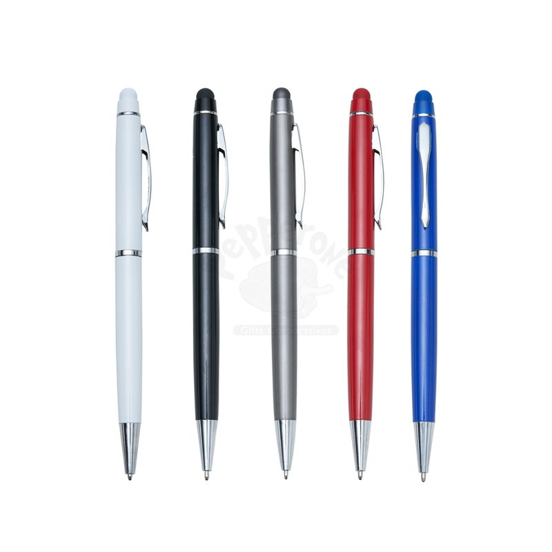 Caneta de metal personalizada com ponteira touch, clip e anel cromado e esferográfica cor azul com acionamento por giro. Imagem ilustrativa. Ideal para brindes promocionais e eventos corporativos.