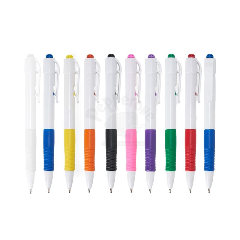 Caneta plástica personalizada produzida em ABS com emborrachado e com rachuras, trazendo maior conforto durante sua escrita. Possui clip injetado, esferográfica cor azul e acionamento da escrita por click. Ideal para brindes promocionais e eventos corporativos.