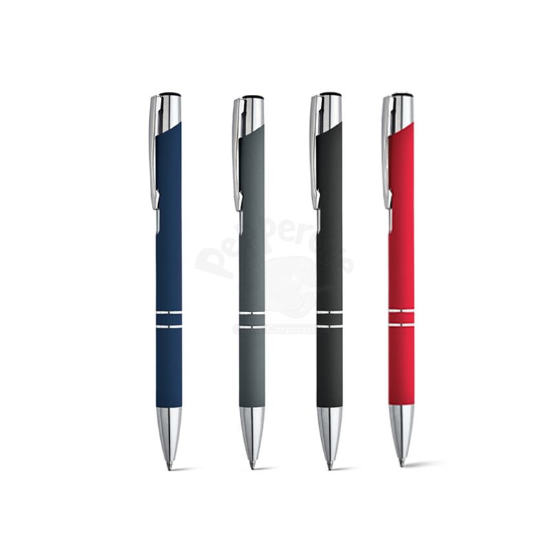 Caneta de Metal personalizada com corpo de textura emborrachada, clip de metal esferográfica na cor azul e acionamento por clik. Ideal para brindes promocionais e eventos corporativos.