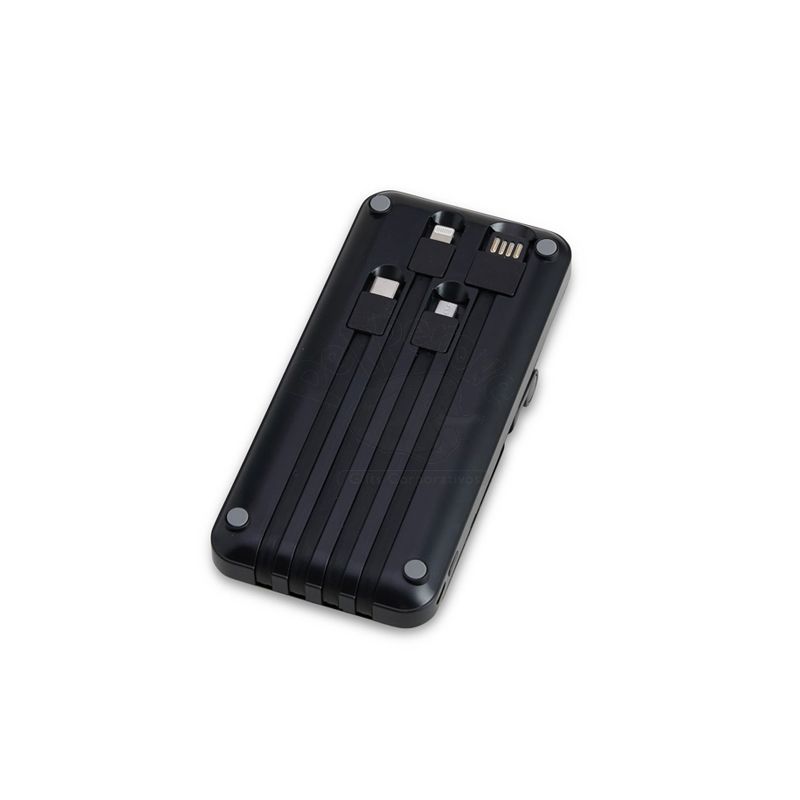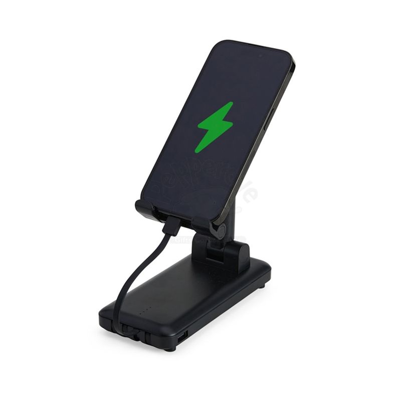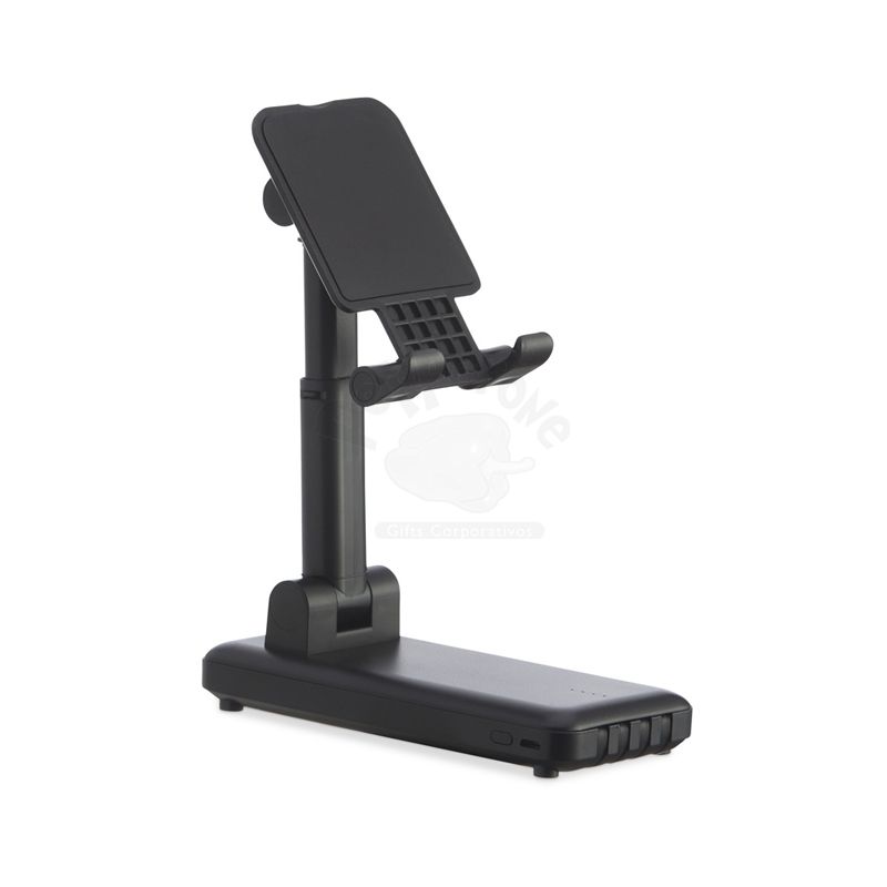 Power bank 10.000mAh multissaídas com suporte retrátil para celular ou tablet. Com indicadores led de bateria e base antiderrapante, o carregador possui os cabos tipo-C, lightning, , V8 e USB acoplados. Acompanha cabo USB V8 e adaptador lightning.