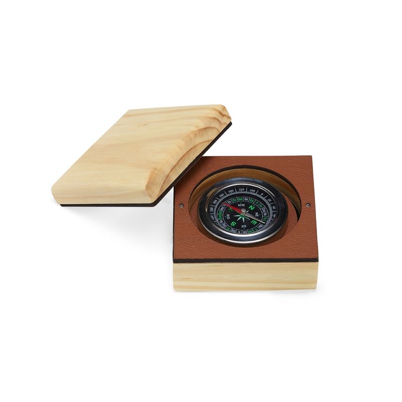 Bússola personalizada, acompanhada por um estojo imantado feito com madeira de reflorestamento, recouro e acabamento em veludo. Esse estojo não apenas proporciona um armazenamento seguro para a bússola, como também adiciona um toque de sofisticação ao conjunto, sendo perfeito para presentear ou exibir em uma coleção de objetos preciosos.