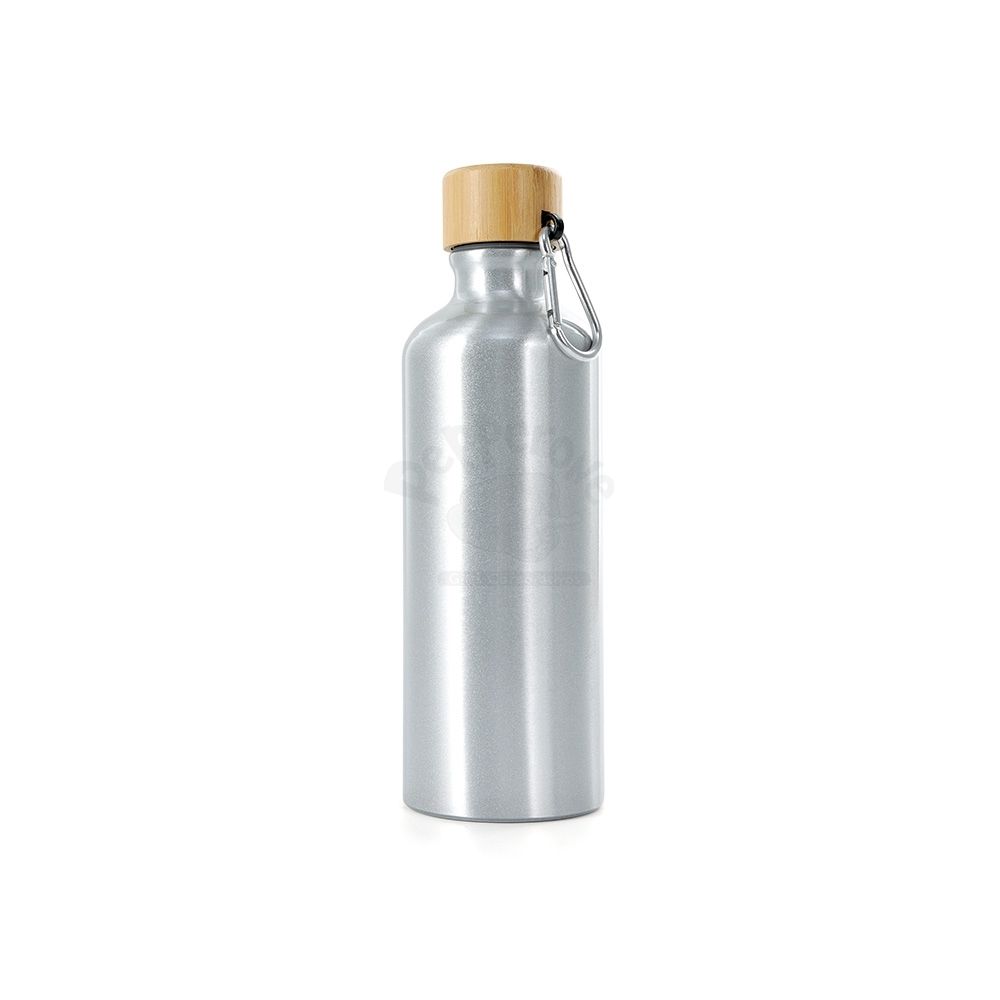 Garrafa de alumínio com capacidade de 500ml. Possui tampa de bambu e acompanha mosquetão de alumínio.