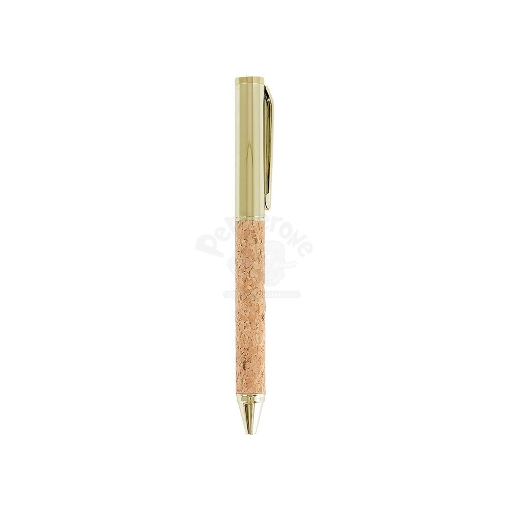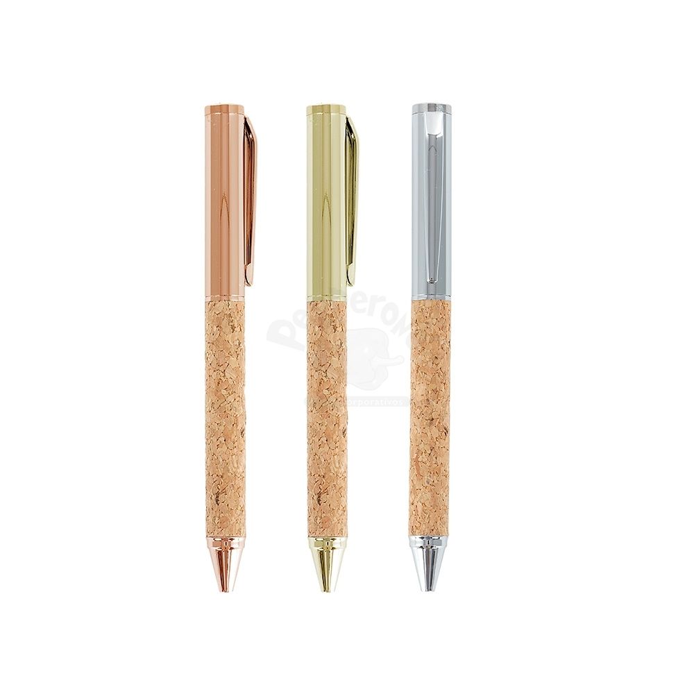 Caneta metálica com detalhe em cortiça, carga esferográfica azul 1.0mm e acionamento por rotação.