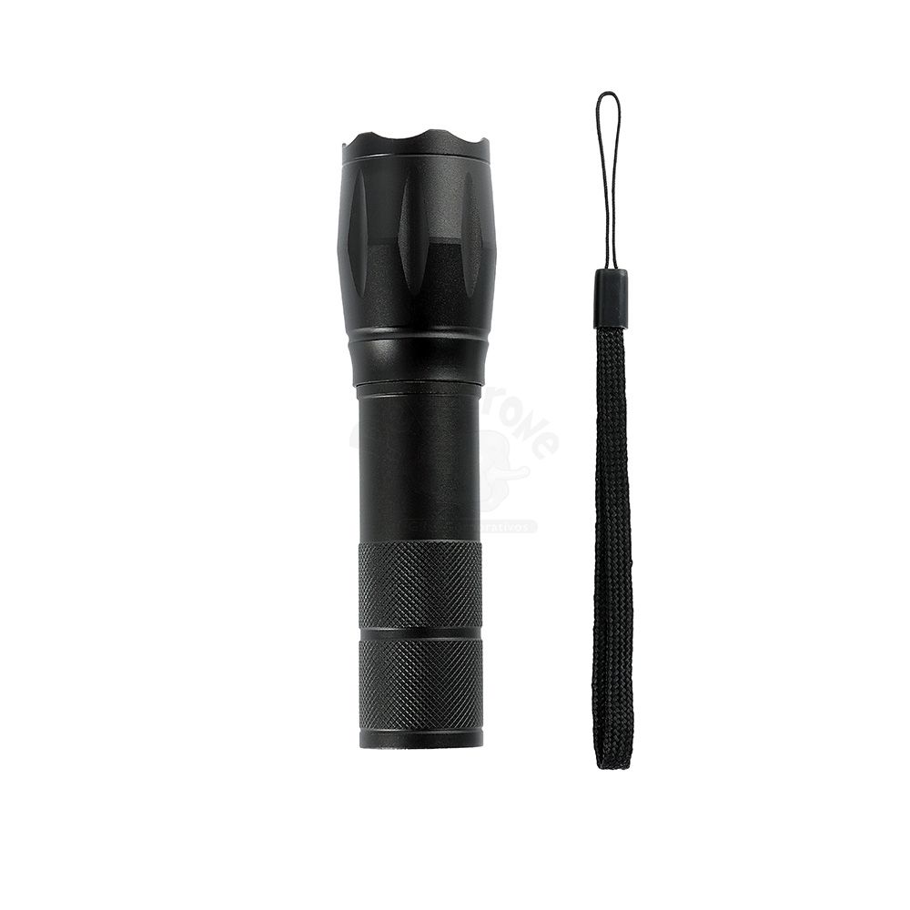 Lanterna led recarregável com zoom de regulagem e três estágios de iluminação, material metálico. Acompanha cordão de nylon e cabo USB-V8.